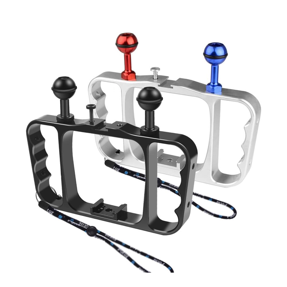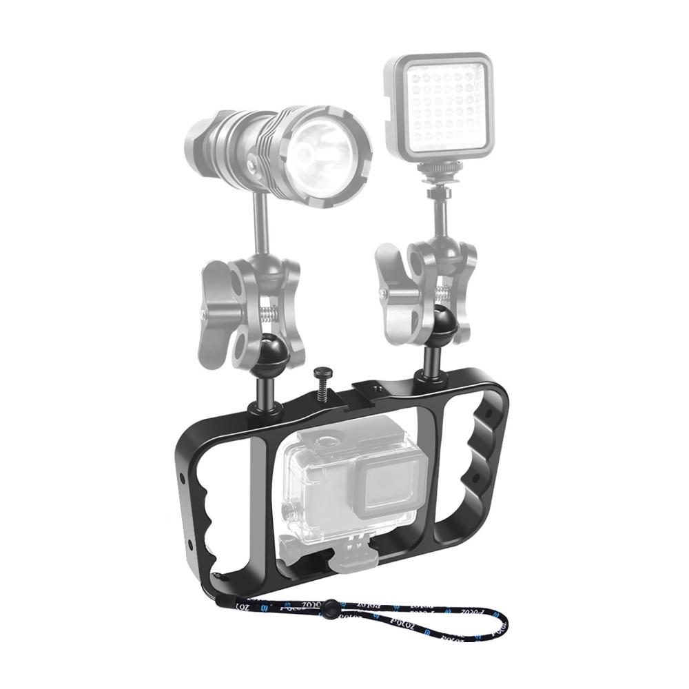 【Ausgewogene Unterwasseraufnahmen】Diese Doppelkameraablage ist leicht und kann als Bildstabilisierungssystem oder als ultimative Tauchausrüstung für die Kamera verwendet werden. Die Unterwasserablage kann mit verschiedenen Videoleuchten ausgestattet werden.