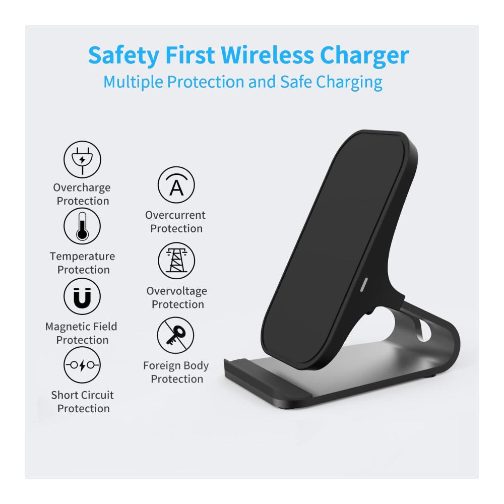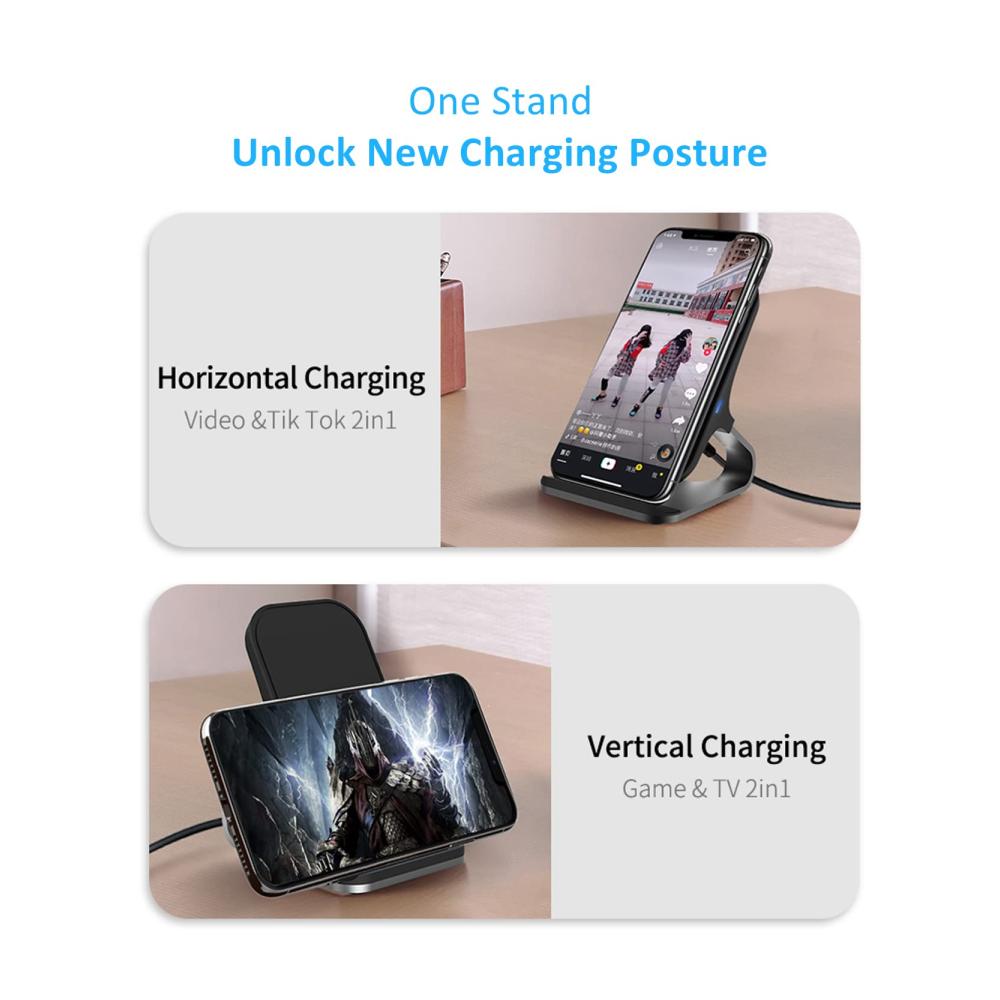 Kabelloser Ladeständer mit einer maximalen Leistung von 15W und Qi-Technologie. Kompatibel mit einer Vielzahl von Geräten, darunter Samsung S21/S20, iPhone12 Pro Max und mehr. Dank der eingebauten 2-Spulen bietet er einen breiteren und stabileren Ladebereich, sodass Sie Ihr Telefon vertikal oder horizontal platzieren können, während Sie Filme ansehen, Musik hören oder Nachrichten senden. Die universelle Kompatibilität ermöglicht eine schnelle Ladung für LG, Samsung Galaxy und iPhone. Das Set enthält ein USB-C Kabel und bietet eine freundliche Handhabung von Schutzhüllen. (Adapter nicht enthalten)