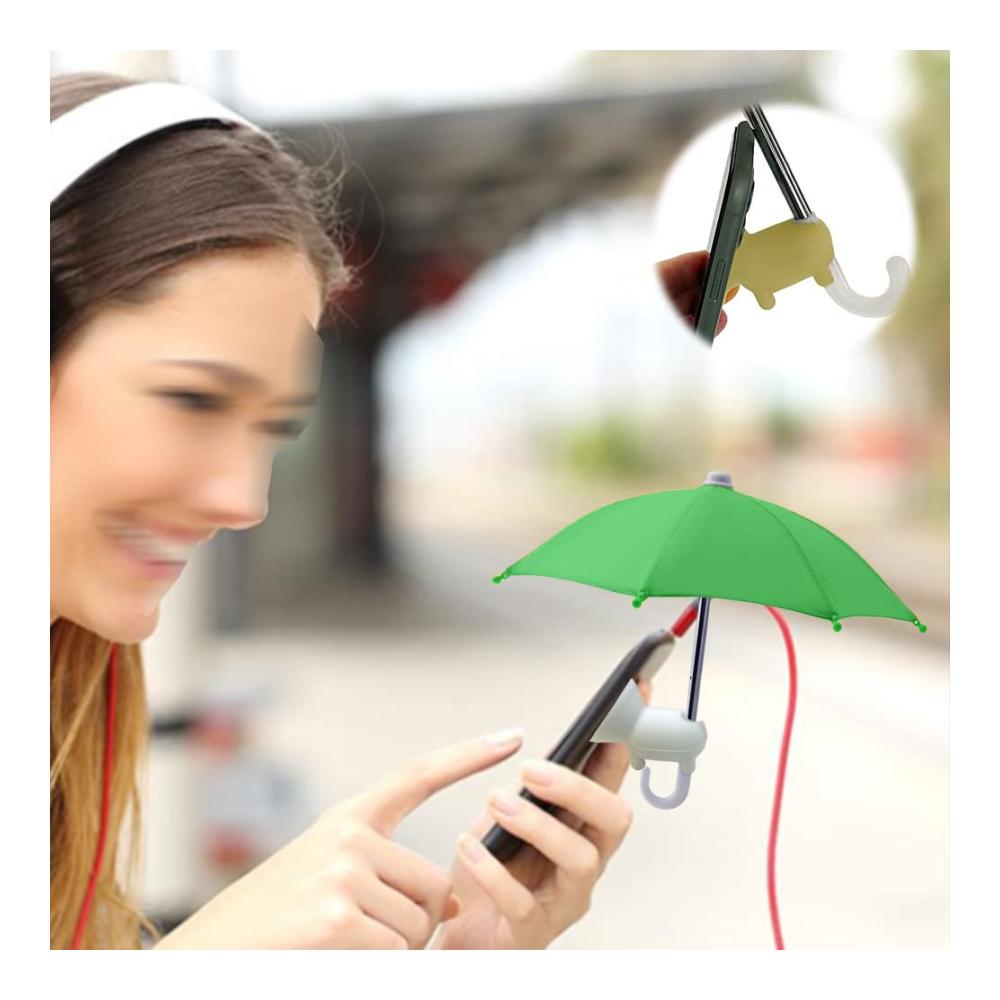 Hergestellt aus hochwertigem Silikon, langlebig und stabil. Ideal zum Radfahren und für den Einsatz im Freien. Set enthält 2 Silikon-Handyständer und 2 kleine Regenschirme.