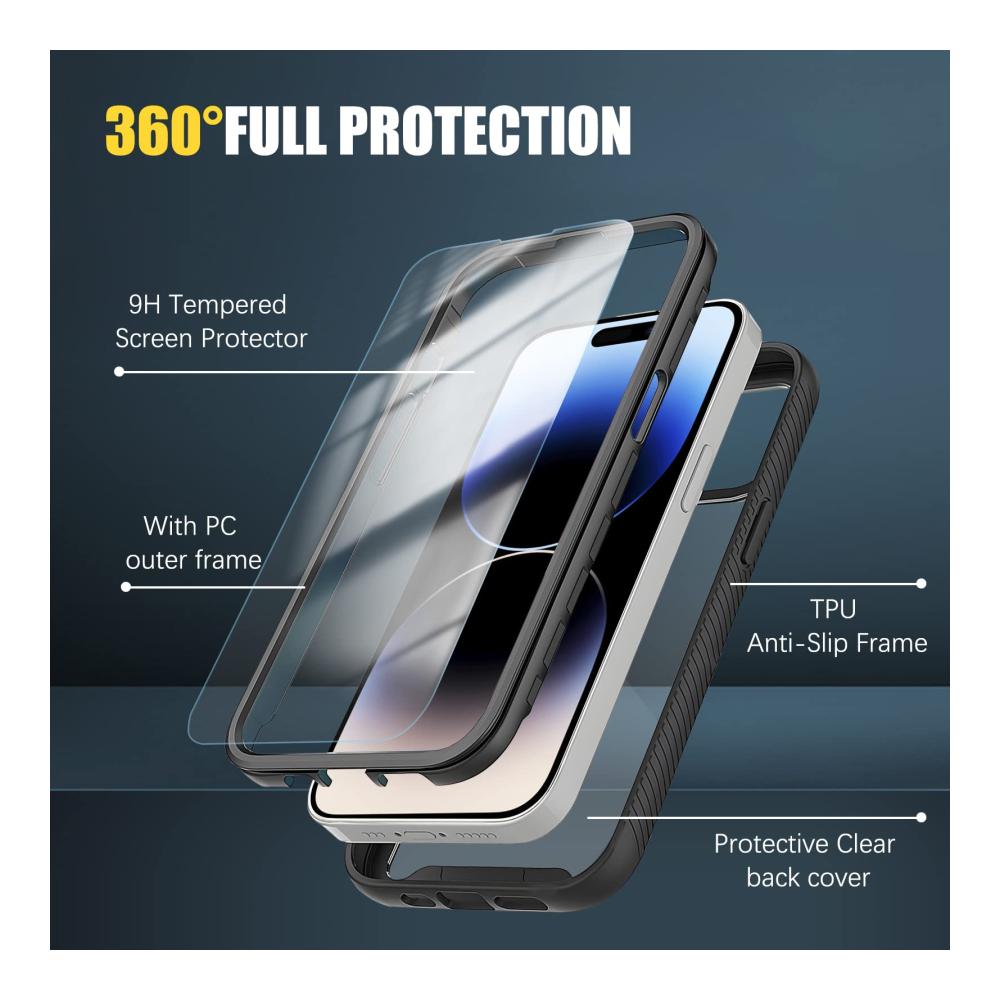📱【360°-Ganzkörper】Die iPhone 14 Pro Schutzhülle mit doppellagigem Design des Außenrahmens und stabiler transparenter Rückseite bietet 360°-Ganzkörperschutz für Ihr neues iPhone. Die mitgelieferte Displayschutzfolie aus gehärtetem Glas mit Härtegrad 9H schützt Ihren Bildschirm perfekt vor Kratzern und Stößen.