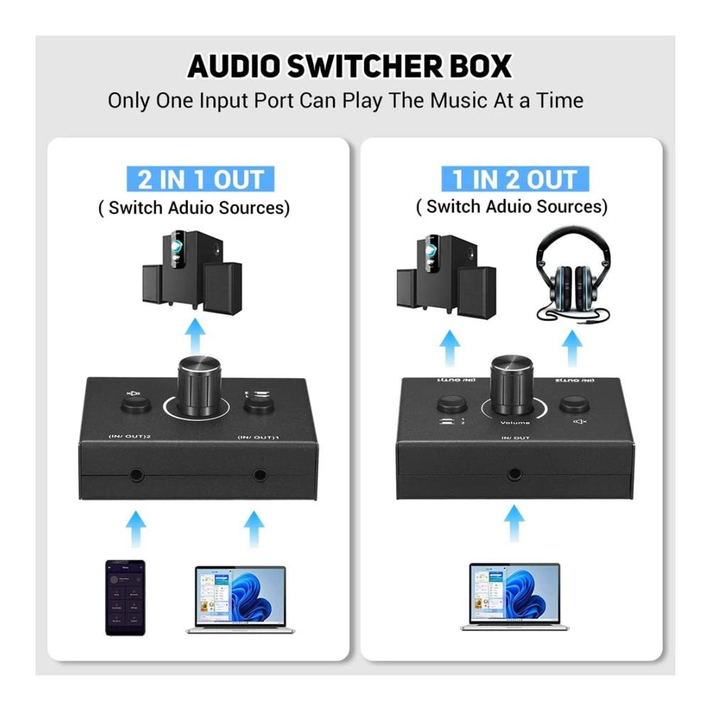 [2-Port-3,5-mm-Audioschalter] Methode 1: Verbinden Sie 2 Audios mit (IN/OUT)1 und (IN/OUT)2, verwenden Sie den 1/2-Schalter, um einen Ausgang zu erhalten. Methode 2: Schließen Sie ein Audio an zu IN/OUT, wählen Sie einen Audioausgang zwischen (IN/OUT)1 und (IN/OUT)2; (Der Ausgang kann zwischen Lautsprecher und Kopfhörer umgeschaltet werden).
