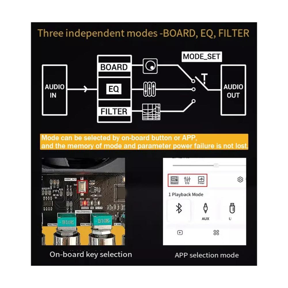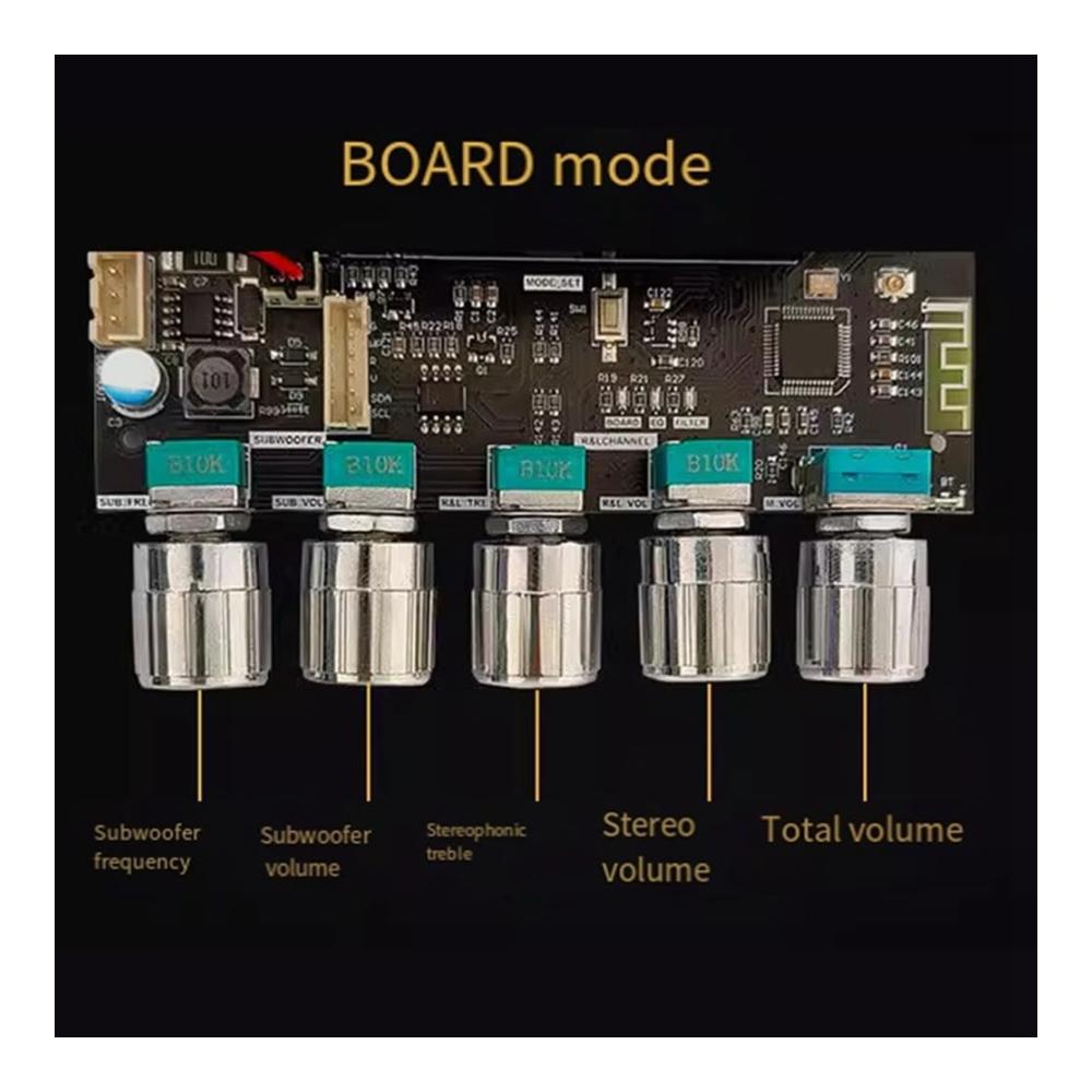 Board- – Fünf Knöpfe zum Einstellen, nämlich Gesamtlautstärke, Stereo-Lautstärke, Stereo-Höhen, Subwoofer-Lautstärke und Subwoofer-Frequenz. Entdecken Sie den klassischen dreistufigen Klang mit integrierten Potentiometern zur digitalen Einstellung der Höhen- und Bassfrequenzen. Im Vergleich zur analogen Abstimmung gibt es keine Kohlebürstenreibung und kein Kontaktgeräusch, und es besteht keine Notwendigkeit, Abschirmungsprobleme zu berücksichtigen.