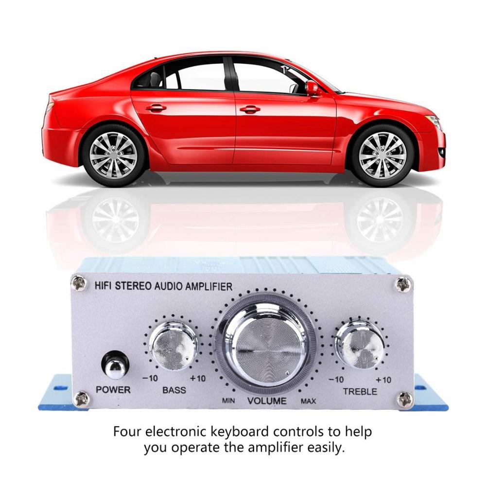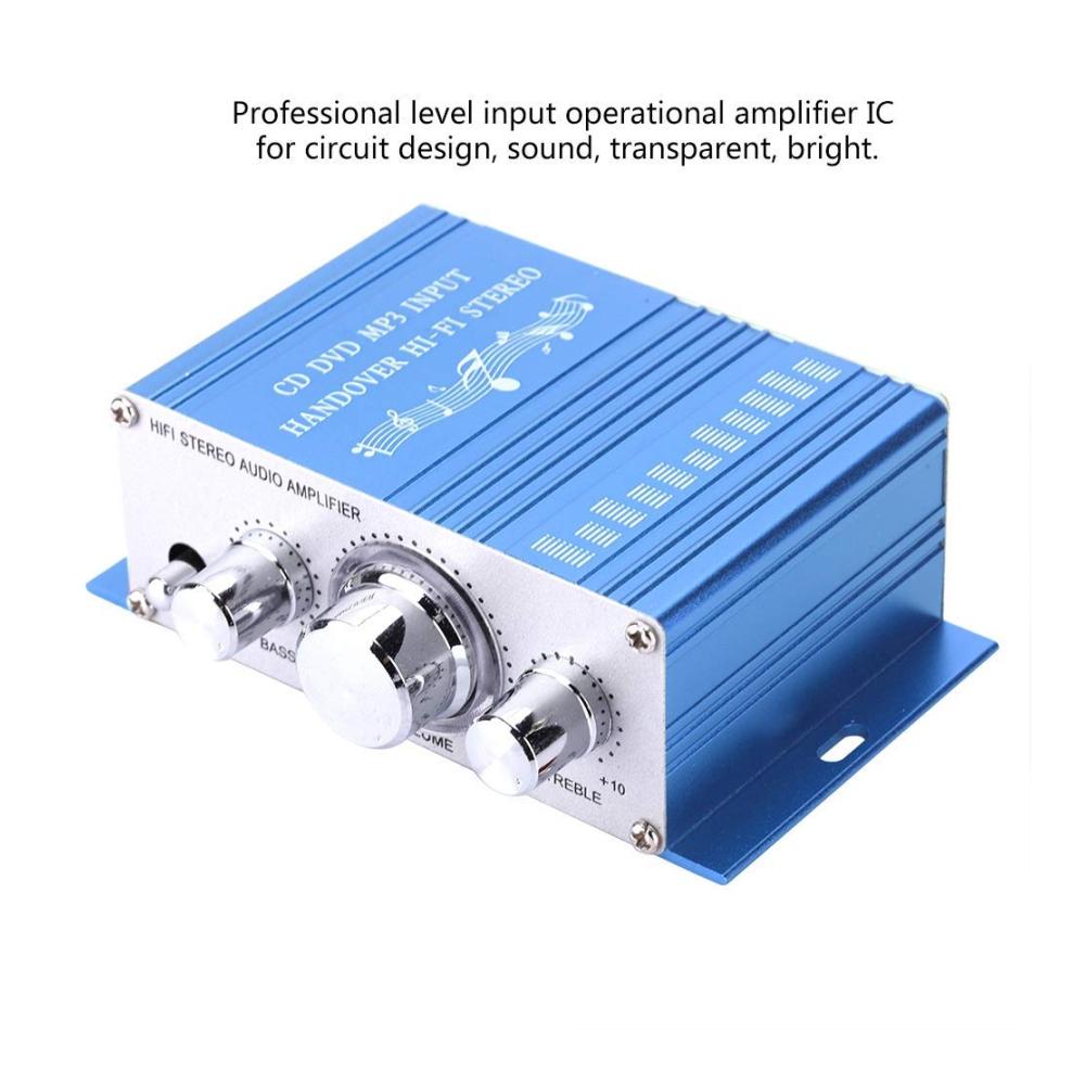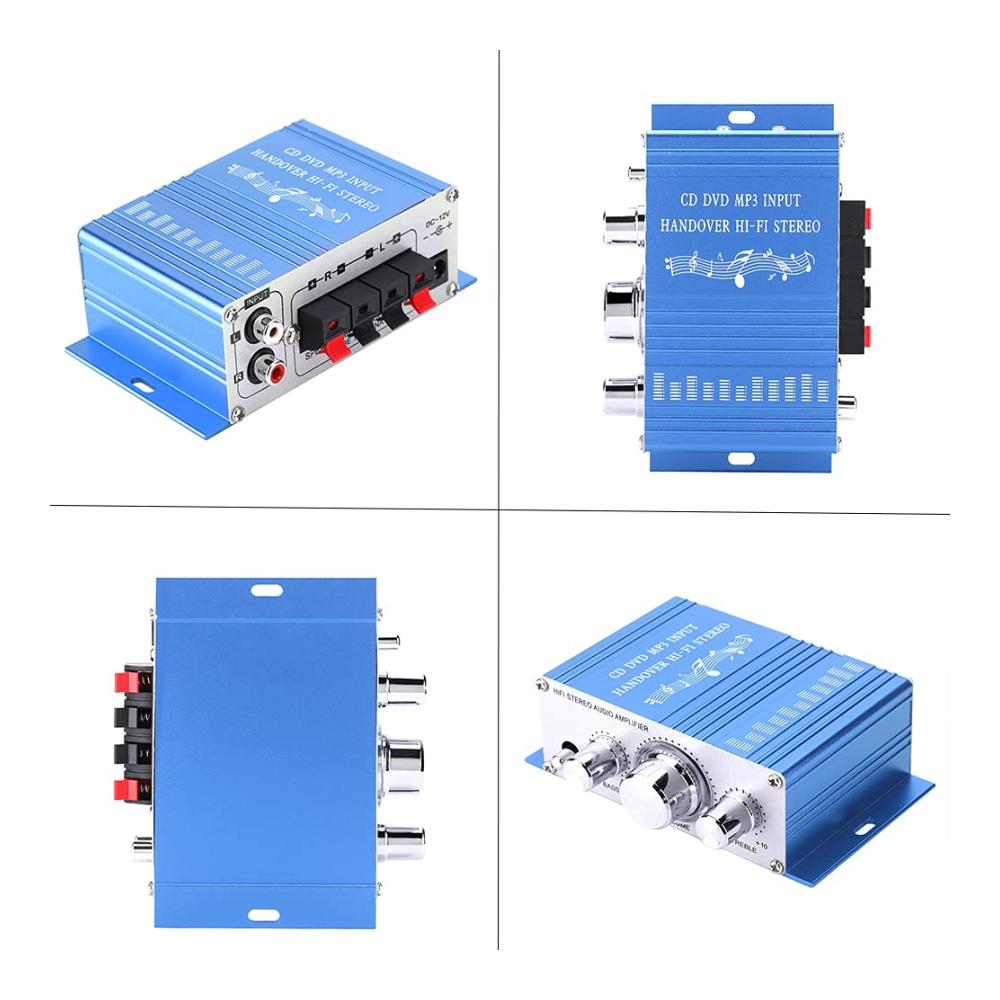 Merkmale: 1. 12-V-Gleichstromversorgung für Autos und Motorräder. 2. Höhen-/Bass-/Lautstärkeregler. 3. CD DVD MP3-Eingang. 4. Ein-/Ausschaltsteuerung. 5. Zwei Hauptkanalausgänge. Spezifikation:Buchseneingang: Standard-Stereobuchse Eingangsspannung: DC 12V Ausgangsleistung: RMS 2 x 20 W 1 kHz Frequenzgang: 20Hz – 20kHz Signal-Rausch-Verhältnis: 85 Dezibel Hohe Kontrolle: 12 dB /- 10 kHz Bassregelung: 12 dB ± 100 Hz Signalpegel: 220 MV 47 K Material: Gehäuse aus Aluminiumlegierung Spannung: DC 12V 2A oder mehr Anschluss: 2,1 * 5,5 mm Material: Aluminiumlegierung Besonderheiten: Unterstützt USB, MP3, FM, SD, DVD Produktgröße (Länge x Breite x Höhe): ca. 12,50 * 7,00 * 4,00 cm/4,92 * 2,76 * 1,57 Zoll Paketgröße (Länge x Breite x Höhe): ca. 13,00 * 10,00 * 4,50 cm/5,12 * 3,94 * 1,77 Zoll Farbe: Blau, Rot (optional) Paketliste:1 * HY – 2001 Autoverstärker 1 * Deutsches Benutzerhandbuch