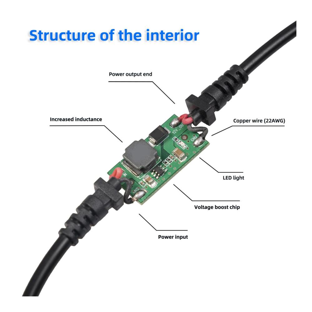 Die Eingangsspannung beträgt 5V und der Ausgang liefert zuverlässig 12V, mit einem maximalen Ausgangsstrom von 1,5A und einer Gesamtausgangsleistung von 15W.