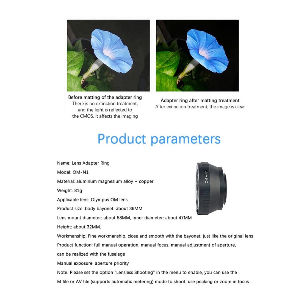 Material: Ganzmetall-Präzisionsbearbeitung, Ringkörper aus Aluminiumlegierung mit feinem Kupferbajonett (trägt das Objektiv nicht), langlebig, die Innenwand ist lackiert und matt behandelt, um Reflexionen auf dem CMOS zu vermeiden und die Bildgebung zu beeinträchtigen.