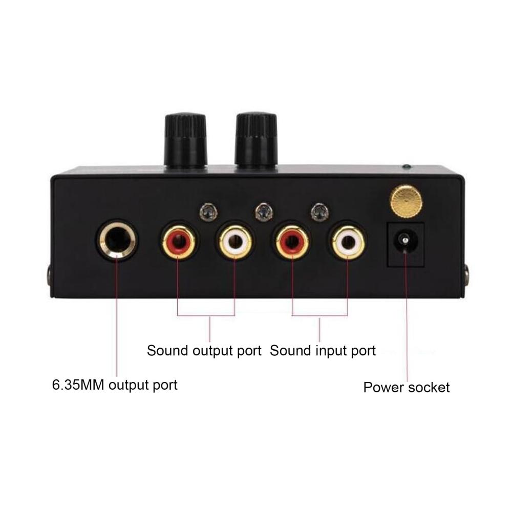 Mehrere Anschlussmöglichkeiten: 2 RCA-Eingänge (L, R), 2 RCA-Ausgänge (L, R), 1 1/4-Zoll-Ausgänge, um den Anforderungen verschiedener Audiogeräteanschlüsse gerecht zu werden.