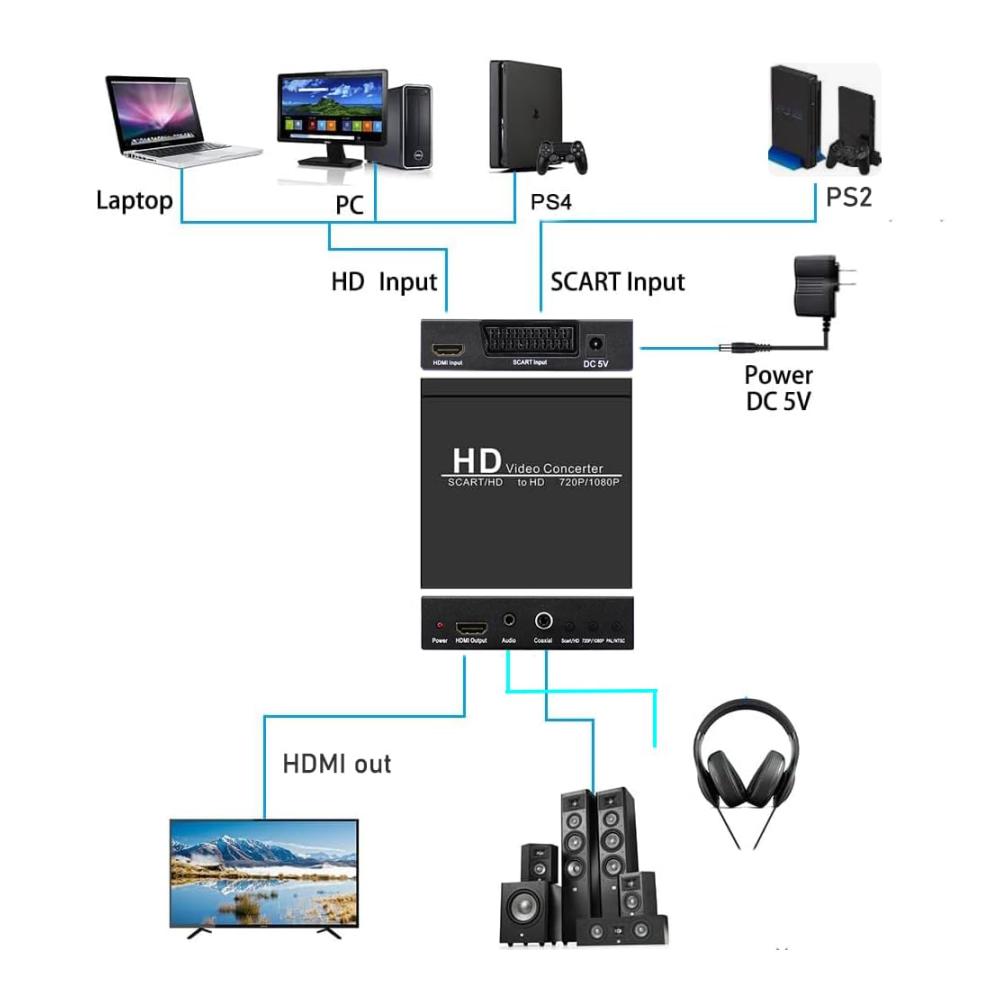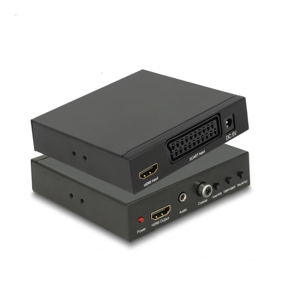【1080P HDMI Scart】Ein HDMI -Eingang ist vorhanden, damit der Konverter als Schalter verwendet werden kann. Beide Eingänge können über den integrierten Videoprozessor für eine 720p- oder 1080p -HDMI -Ausgabe mit 50 oder 60 Hz skaliert werden. Das Audiosignal ist gleichzeitig am HDMI -Ausgang, als digitales Signal S/PDIF und als analoges Signal in Stereo -Socket erhältlich.