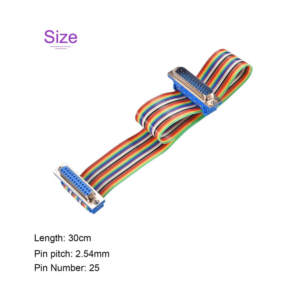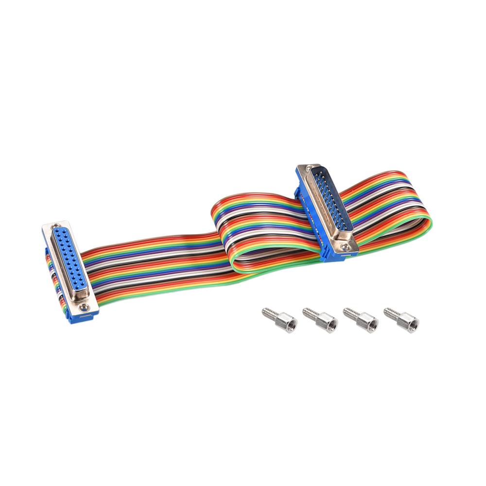 Produkt: Flachbandkabel; Pin-Anzahl: 25; Länge: 30cm; Gesamtbreite: 31,8mm; Pin-Abstand: 2,54 mm; Typ: DB25 Stecker auf Buchse; Farbe: Regenbogenfarbe.