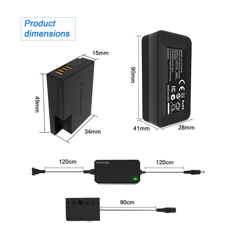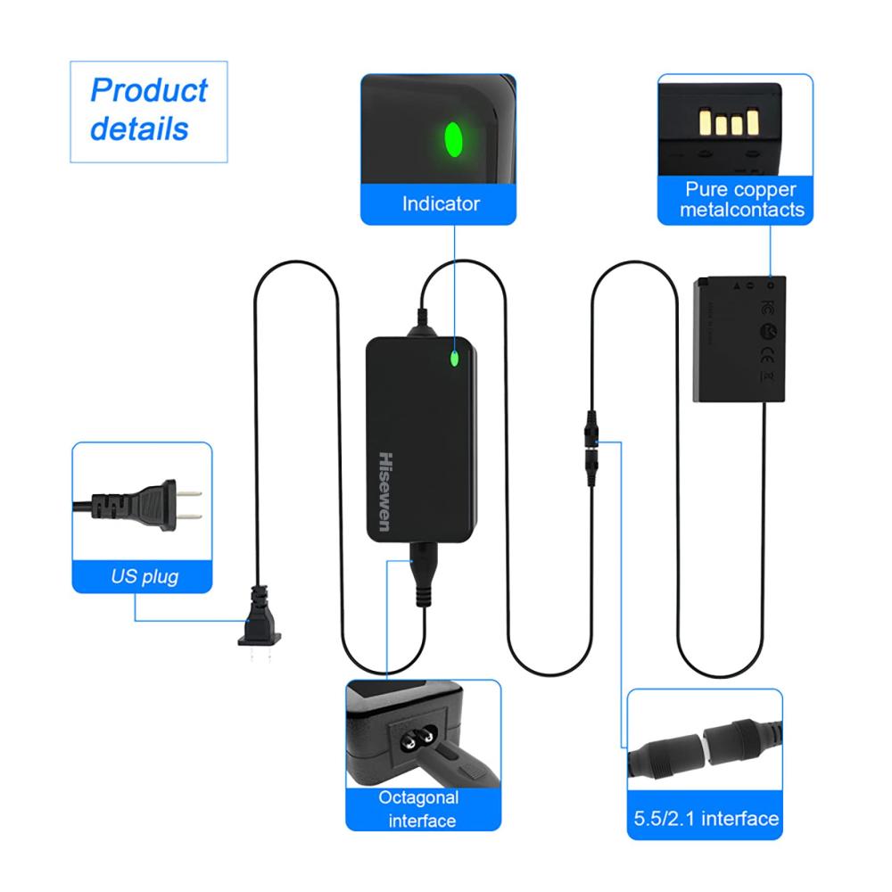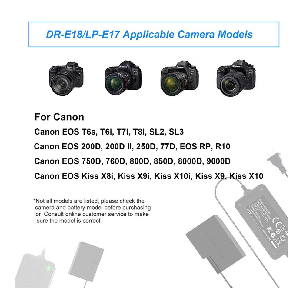 Hisewen ACK-E18 AC Power Adapter DR-E18 DC Coupler LP-E17 Dummy-Akku für Canon Kameras.Ersatz-Akku: LP-E17 Kompatibel mit Kamera: EOS R8 EOS R10 EOS R50 EOS R100 EOS RP EOS 77D EOS 750D(Kiss X8i), EOS 760D, EOS 800D(Kiss X9i), EOS 850D(Kiss X10i), EOS 200D(Kiss X9), EOS 200D II(Kiss X10), EOS 250D, EOS 8000D, EOS 9000D, Rebel T6s, T6i, T7i, T8i EOS SL2, SL3 HINWEIS: Nicht geeignet für Canon EOS M3, M5, M6, T6, T7Spezifikation: Eingabe:100~240Vac,1.5A Max 50/60Hz, Ausgabe: DC 8.4V 2A 16.8W; AC Cable 4 ft / 120cm, DC Cord 4 ft / 120cm, Coupler Cord 1.2 ft / 35cm. Anmerkungen: Die Dummy-Batterie kann nicht allein verwendet werden.Liste der Pakete: 1 * ACK-E18 Netzadapter, 1 * LP-E17 Dummy-Akku, 1 * AC-Kabel (EU-Stecker).