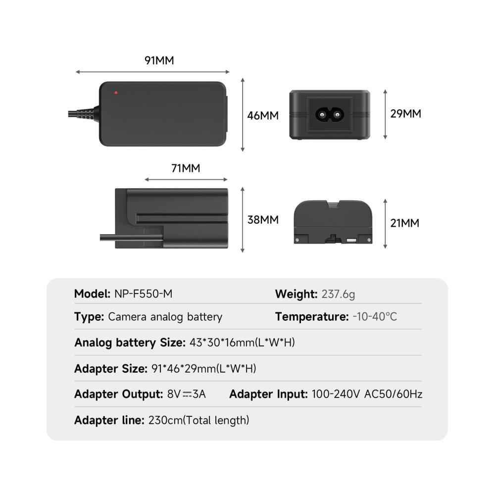 Dieser F550 Dummy-Akku AC Power Adapter ist kompatibel mit der NP-F Serie NP-F550/570/750/770/970.
