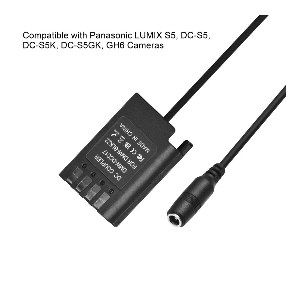 Das DMW-DCC17 AC-Netzteil DMW-BLK22 Dummyakku DC-Koppler Kit ist ein unverzichtbares Ersatzteil für Panasonic LUMIX S5, DC-S5, DC-S5K, DC-S5GK und GH6 Kameras. Der Dummy-Batterie-Koppler DMW-DCC17 bietet eine praktische Lösung zum Austausch der DMW-BLK22 Batterie und ermöglicht eine kontinuierliche Stromversorgung.