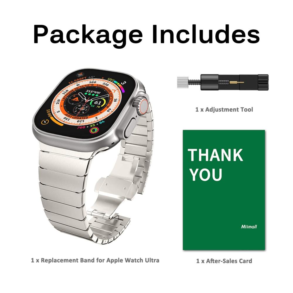 [Miimall Service] Das Paket beinhaltet: 1 x Edelstahl Metall Armband für Apple Watch Ultra 1&2 49mm & Series 9/8/7/6/SE/5/4/3/2/1 45mm 44mm 42mm, 1 x Längen Einstellwerkzeug, 1 x After Sales Karte. Wenn Sie weitere Fragen haben, können Sie sich gerne an uns wenden. Wir werden Ihnen innerhalb von 24 Stunden antworten.