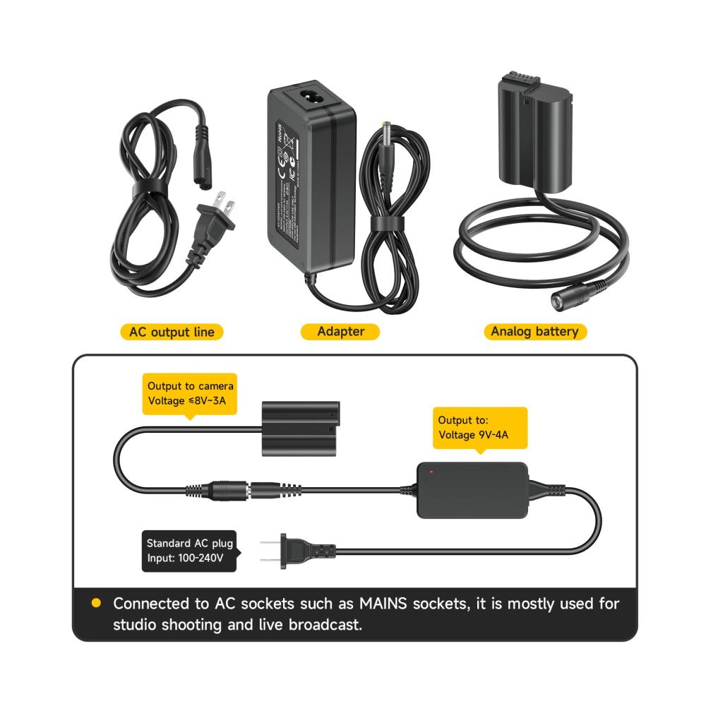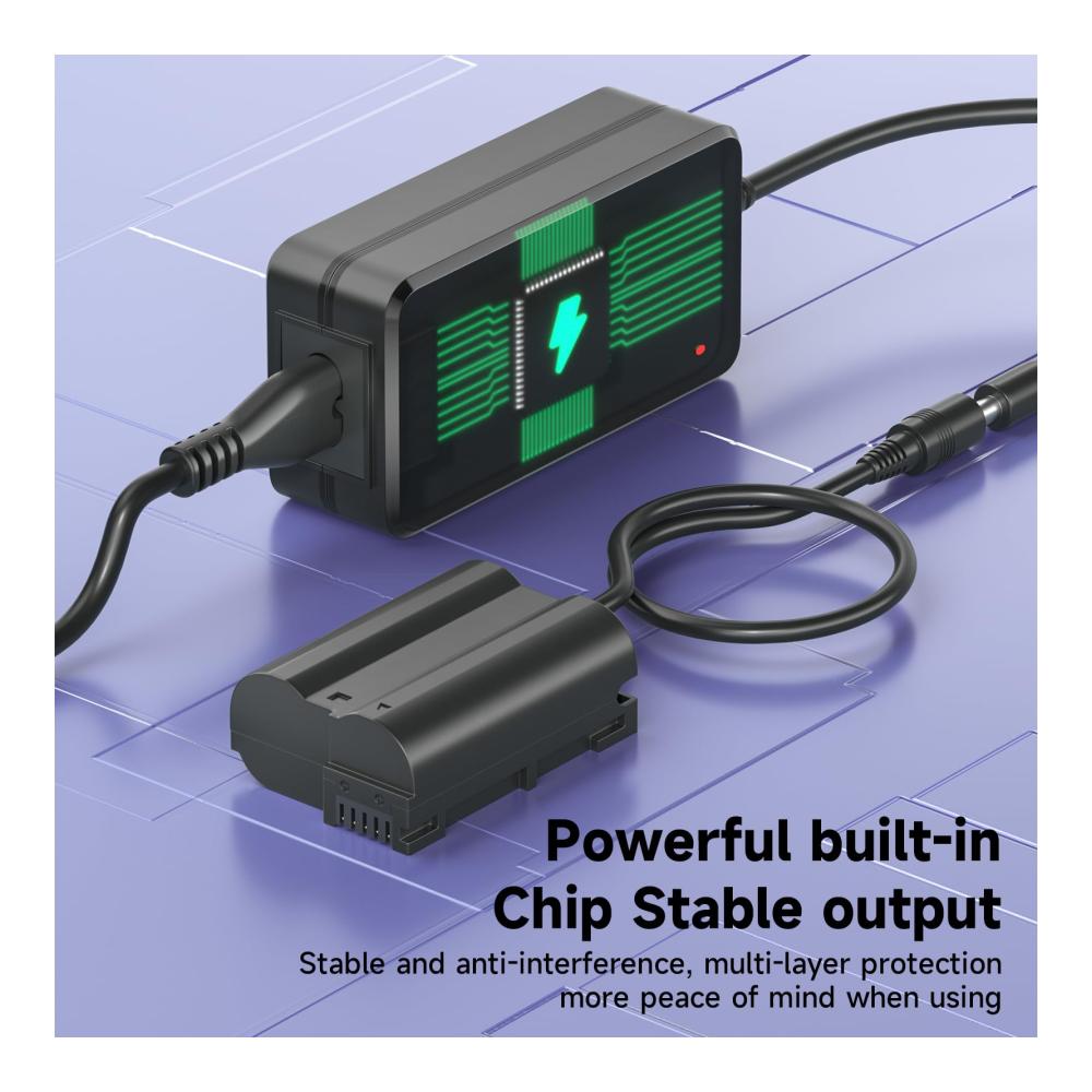 Holen Sie sich zuverlässige Stromversorgung für Ihre Nikon-Kameras mit unserem ENEL15 Dummy Akku Kit AC-Netzteiladapter. Unsere Lösung bietet Sicherheit und Komfort für Langzeitaufnahmen und Videoaufnahmen.