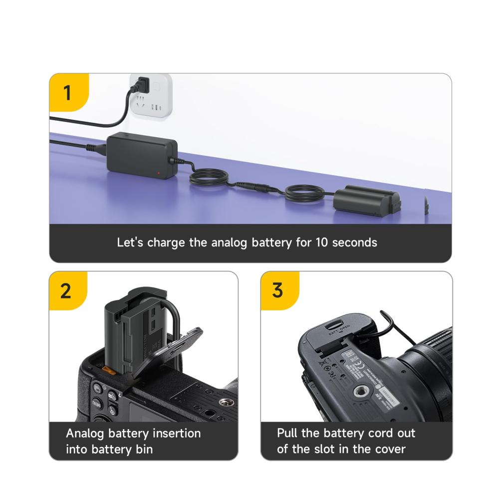 Speziell für Studioaufnahmen konzipiert, eliminiert unser Dummy-Akku lästiges Batterieaustauschen und -aufladen. Bleiben Sie kontinuierlich mit Strom versorgt, um Ihre kreativen Projekte ohne Unterbrechung fortzusetzen.