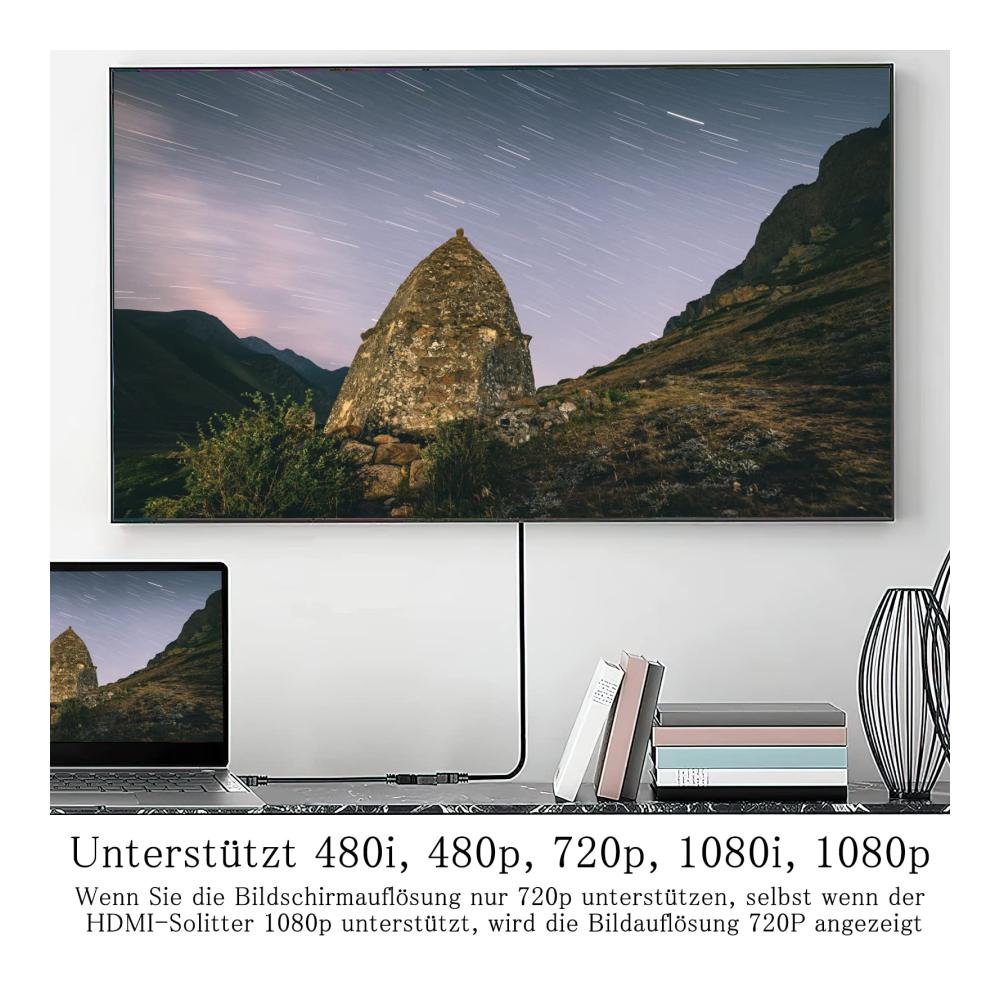 2.【unterstützt HD-Auflösungen】Dieser HDMI-Splitter unterstützt HD-Auflösungen, einschließlich 480i, 480p, 720p, 1080i, 1080p. HDMI Verteiler hat eine Auflösung von 4K@30Hz, 1080P@60Hz, was für die meisten Displays eigentlich geeignet ist. Dieses HDMI Splitterkabel ist ideal für den Anschluss eines HDMI-fähigen Geräts.
