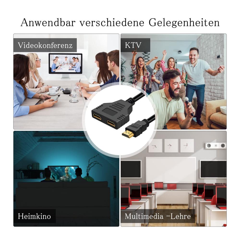 1.【hdmi splitter 2 in 1 out】Dieser HDMI Splitter Adapter kann 1 HDMI Eingangssignal auf zwei HDMI Ausgänge verteilen. Der hdmi adapter Ermöglicht den Anschluss von HDMI-Geräten, die einen integrierten HDMI-Anschluss haben, wie HDTV, DVD-Player, LCD-Monitor und Projektoren.