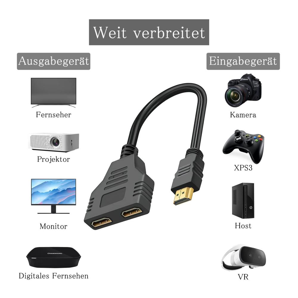 3.【Breite Anwendung-HDMI verteiler】Dieses HDMI-Splitterkabel ist ideal für den Anschluss eines HDMI-kompatiblen Gerätes. Eingang: HD – DVD, Bule – Ray DVD, X-BOX, XPS3, STB, S.ony HD TV. Ausgang: Fernseher, Projektor, Monitor, LCD-Fernseher, Plasma Display, digitales Fernsehen.