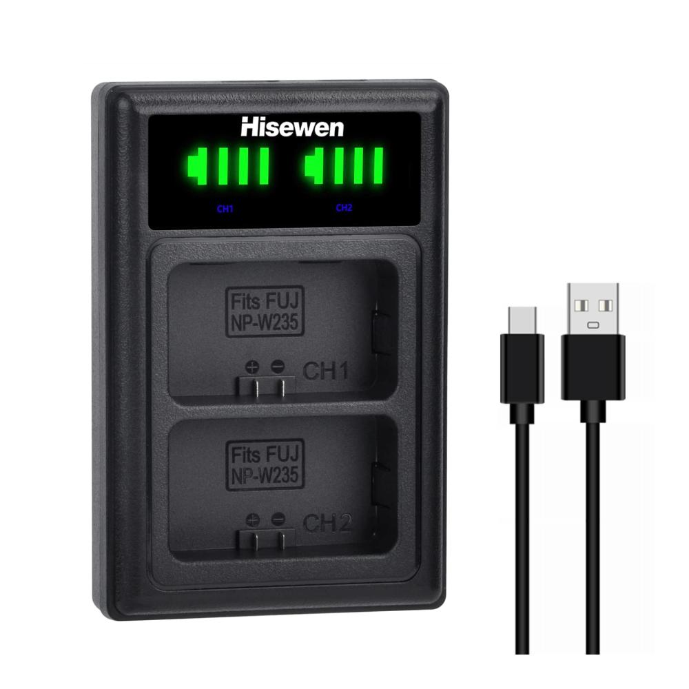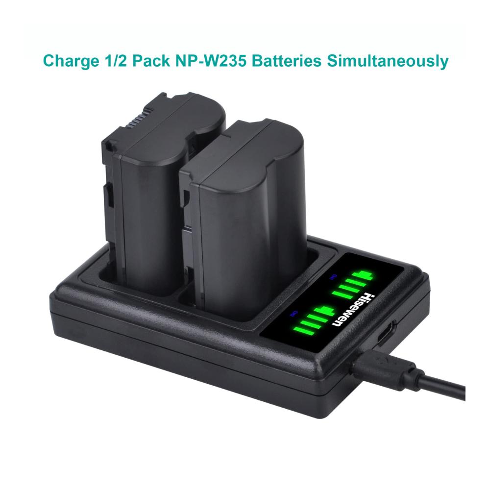 Dieses Hisewen Dual USB Ladegerät für Fujifilm NP-W235 Akku ist perfekt für Fotografen, die unterwegs sind. Kompatibel mit verschiedenen Fujifilm-Kameras und Akku-Griffen. Es lädt zwei NP-W235 Akkus gleichzeitig und unabhängig voneinander auf, bietet eine Echtzeit-Stromanzeige und verfügt über mehrfachen Schutz. Das Paket enthält ein Typ-C Ladekabel und wird durch eine Geld-zurück-Garantie sowie eine 12-monatige Qualitätsgarantie abgesichert. Holen Sie sich dieses zuverlässige Zubehör für Ihre Kameraausrüstung