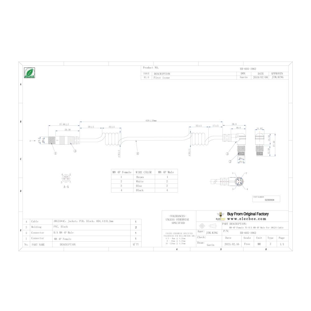 Elecbee M8 4 poliger Spiralkabel, A Code gerader weibliche auf rechtwinkliger winkel männlicher Formkabel Wasserdicht Sensorkabelstecker Industrieller Rundstecker für den Außenbereich 0.62 meter
