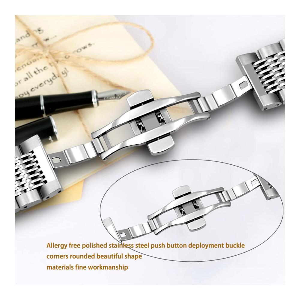 Universelle Passform: Geeignet für Handgelenkgrößen von 140-220mm (5.5-8.66 Zoll). Packungsinhalt: 1x Edelstahl-Armband, 1x Werkzeug zum Entfernen von Gliedern, 2x Uhrenösen.