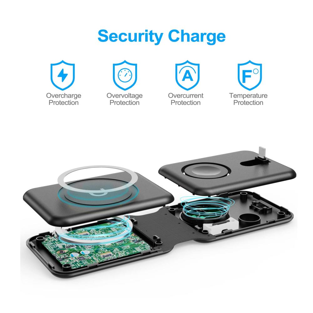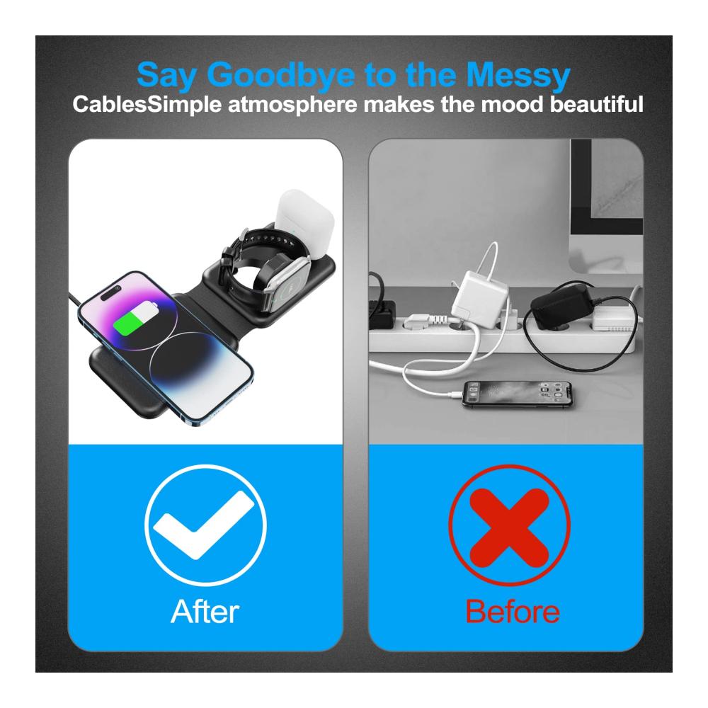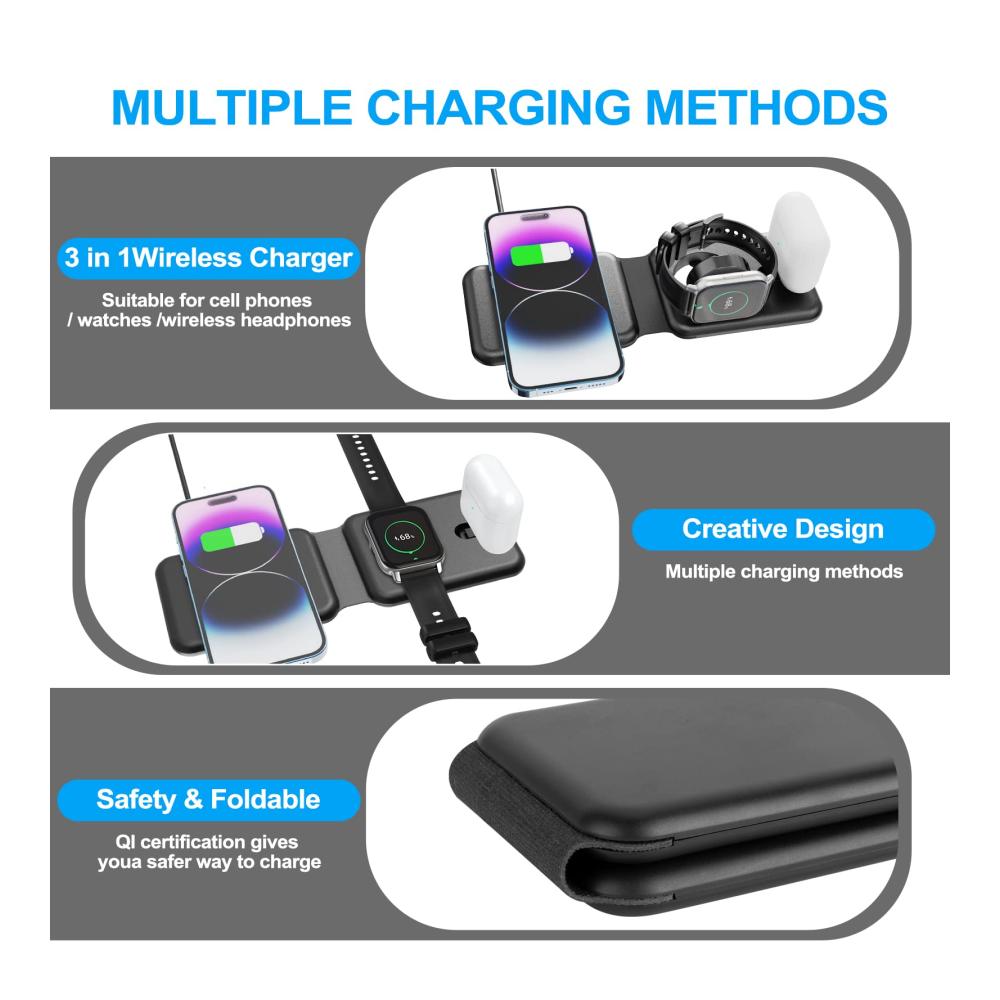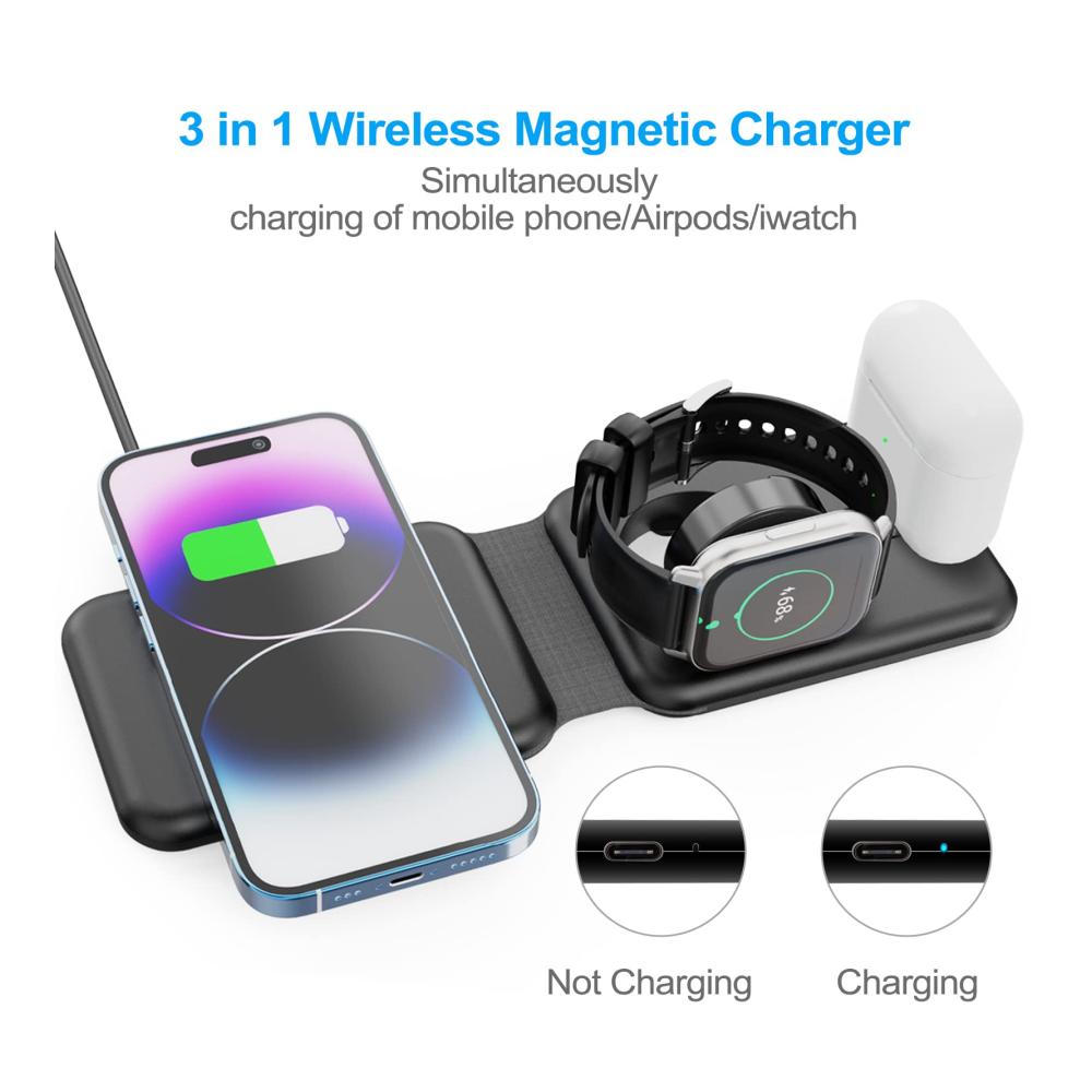 【Magnetisch & faltbar】Dieses kabellose 3-in-1-Wireless Charger lässt sich auf eine kleine Größe zusammenfalten, so dass Sie es in Ihrer Tasche oder Ihrem Rucksack tragen können. Ob Sie zu Hause, bei der Arbeit oder auf einer Geschäftsreise sind, Sie können es überallhin mitnehmen. Sie müssen nicht mehr drei Ladegeräte für Ihr Telefon, Ihre Kopfhörer und Ihre Uhr gleichzeitig mit sich führen. Ein kabelloses 3-in-1-Ladegerät, das alle Ihre Sorgen löst!