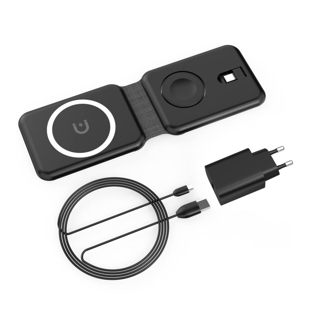 Olycism 3 in 1 Faltbar Kabelloses Ladegerät Magnetic Wireless Charger Ladestation Kompatibel mit i Phone 14 13 12 11 Pro Max/Mini/XS/XR, i Watch 8/7/6/SE/5/4/3/2, Air Pods Pro/2/3 mit Adapter Schwarz