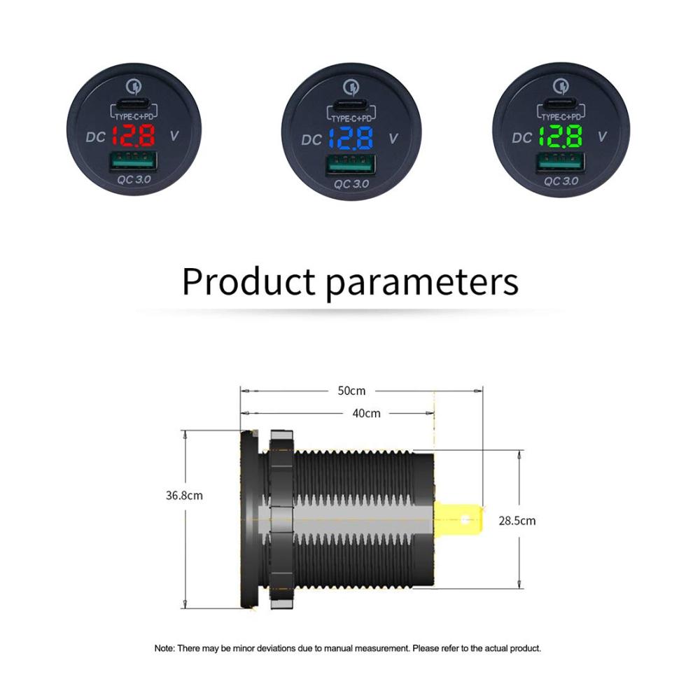 Spezifikationen : Gewicht: 35g Nennleistung: 36W Eingang: DC 12V-24V Ausgang (QC3.0-Port): 3,6- 6,5V/ 2,4A, 6,5- 9V/ 2A, 9- 12V/ 1,5A Ausgang (PD-Port): 5V/ 2,4 A, 9V/ 2A, 12V/ 1,5A. Hinweis : Es wird empfohlen, für Fahrzeuge Strom aus dem Sicherungskasten zu erhalten. Für das Motorrad ist es besser, an die Kabel des Schlüsselschalters anzuschließen. Der LED-Spannungsmesser wird angezeigt, nachdem das Gerät an die Batterie angeschlossen wurde. Verwenden Sie für eine optimale Ladegeschwindigkeit Ihr Original-Schnellladekabel oder ein von einem Drittanbieter zertifiziertes Kabel (z.B. MFI). Einige Mobiltelefone unterstützen schnelles Aufladen nicht, wie die iPhone-Serie. Es passt sich automatisch an die normale Ladegeschwindigkeit an. Package Includes: 1 * Dual Ports USB-Steckdose 1 * 60CM Draht