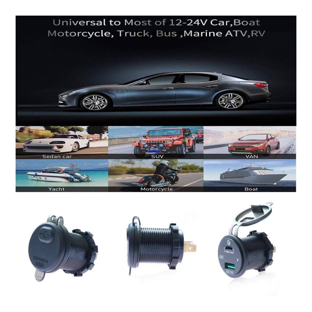 DC 12-24V Auto, Boot, Marine, Motorrad, ATV, RV etc. Einfach zu installieren, indem Sie ein Loch bohren und das Ladegerät in das Loch schrauben. Die Klemmen auf der Rückseite sind mit &34; &34; und &34;-&34; für positive und negative Pole gekennzeichnet. Das Paket enthält ein Verlängerungskabel für eine bessere Verbindung.