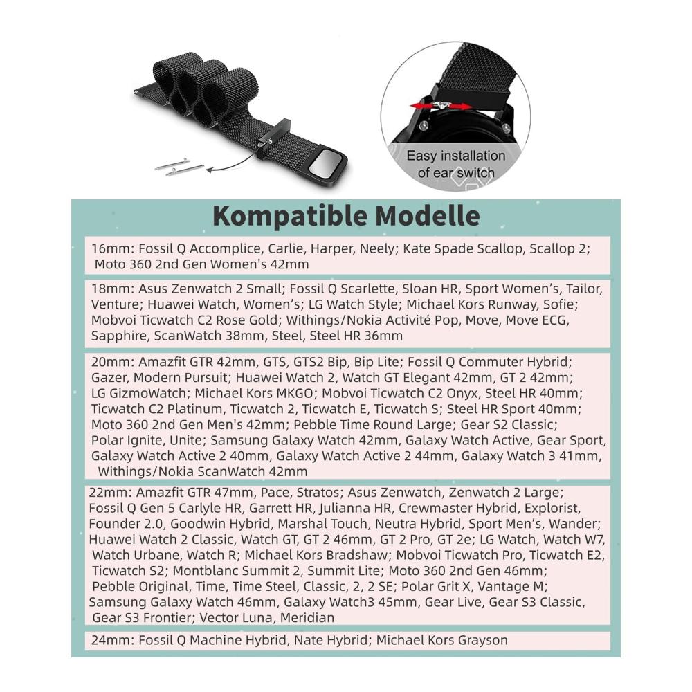 ★[Kompatible Modelle] 20mm Edelstahl Mesh armband geeignet für fast alle Uhren mit 20-mm-Bandanstößen, wie z Samsung Galaxy Watch 6 40mm 44mm/Samsung Galaxy Watch 6 Classic 43mm 47mm/Samsung Galaxy Watch 5 40mm 44mm/Galaxy Watch 5 Pro 45mm/Galaxy Watch 4 40mm 44mm/Galaxy Watch 4 Classic 46mm 42mm; Galaxy Watch 3 41mm; Galaxy Active 2 40mm 44mm; Samsung Galaxy Watch 42 mm;Samsung Gear S2 Classic;Garmin Vivomove HR/Vivomove 3/Vivomove Style;Garmin Vivoactive 3;Huawei Watch 2/2 Pro/ Watch GT 42mm.