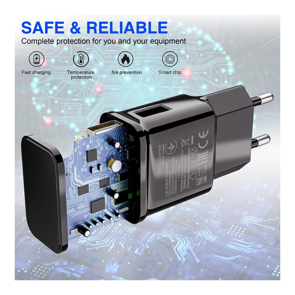 Schnelles Ladegerät liefert bis zu 15W Ausgangsstrom, 75% schneller als Standard-Ladegeräte, es hat auch die Sync-Funktion, vor allem aber ist es für sicheres Laden gemacht, es kann intelligent den Batterietyp und Status erkennen, wird automatisch den Ladevorgang stoppen, wenn voll geladen, um Kurzschluss, Überstrom, Überspannung, Überhitzung und Überladung zu verhindern.