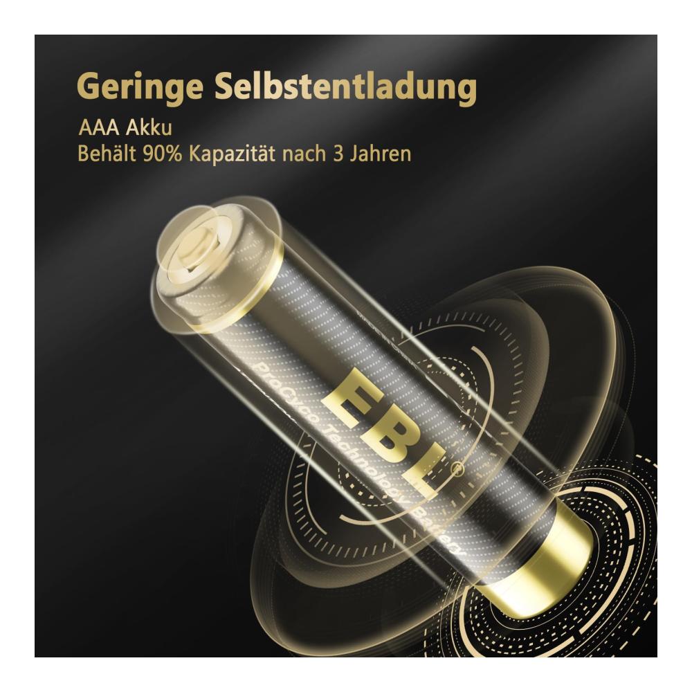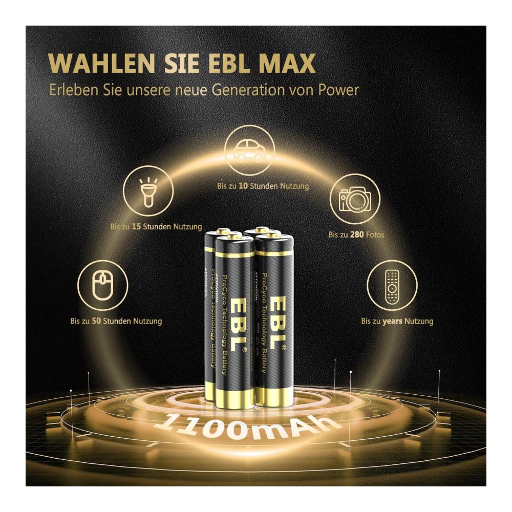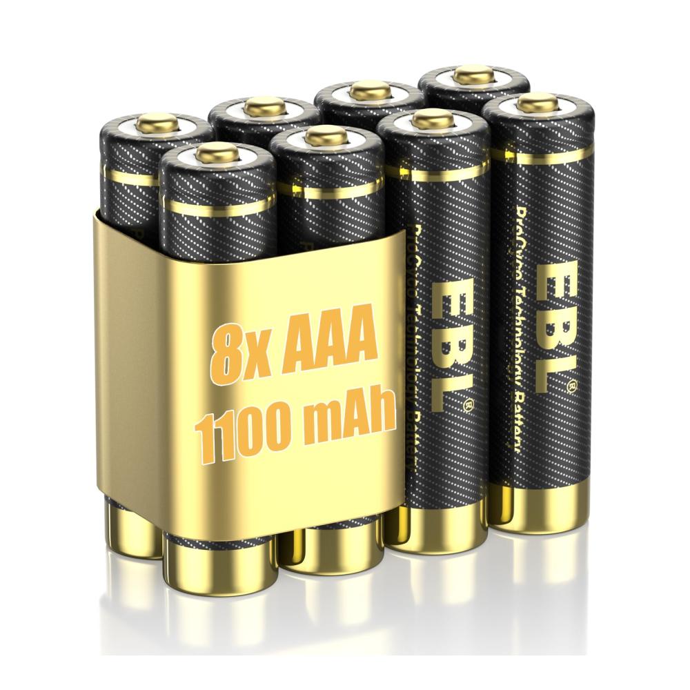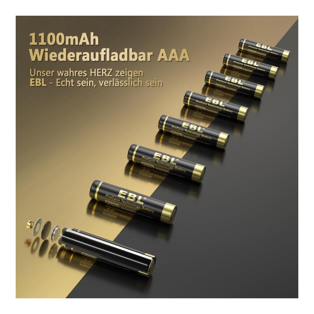 Diese AAA Akkus der Pro Version bieten eine zuverlässige Leistung für Ihre Geräte. Das Paket enthält 8 wiederaufladbare AAA Batterien mit 1100mAh Kapazität. Hergestellt von EBL, einem führenden Hersteller von Batterien und Ladegeräten, sind sie ideal für Kameras und bieten eine lange Lebensdauer. Das NiMH-Design gewährleistet eine geringe Selbstentladung, und sie sind für den Gebrauch bei extremen Temperaturen geeignet.