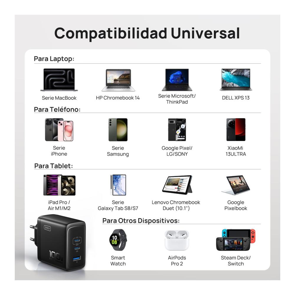 Compatible with a wide range of devices, including smartphones, tablets, laptops, and more, this charger offers universal compatibility. It supports fast charging for devices such as Samsung Galaxy, iPhone, Xiaomi, Google Pixel, laptops like MacBook, iPad models, Apple Watch, AirPods, and various other devices.