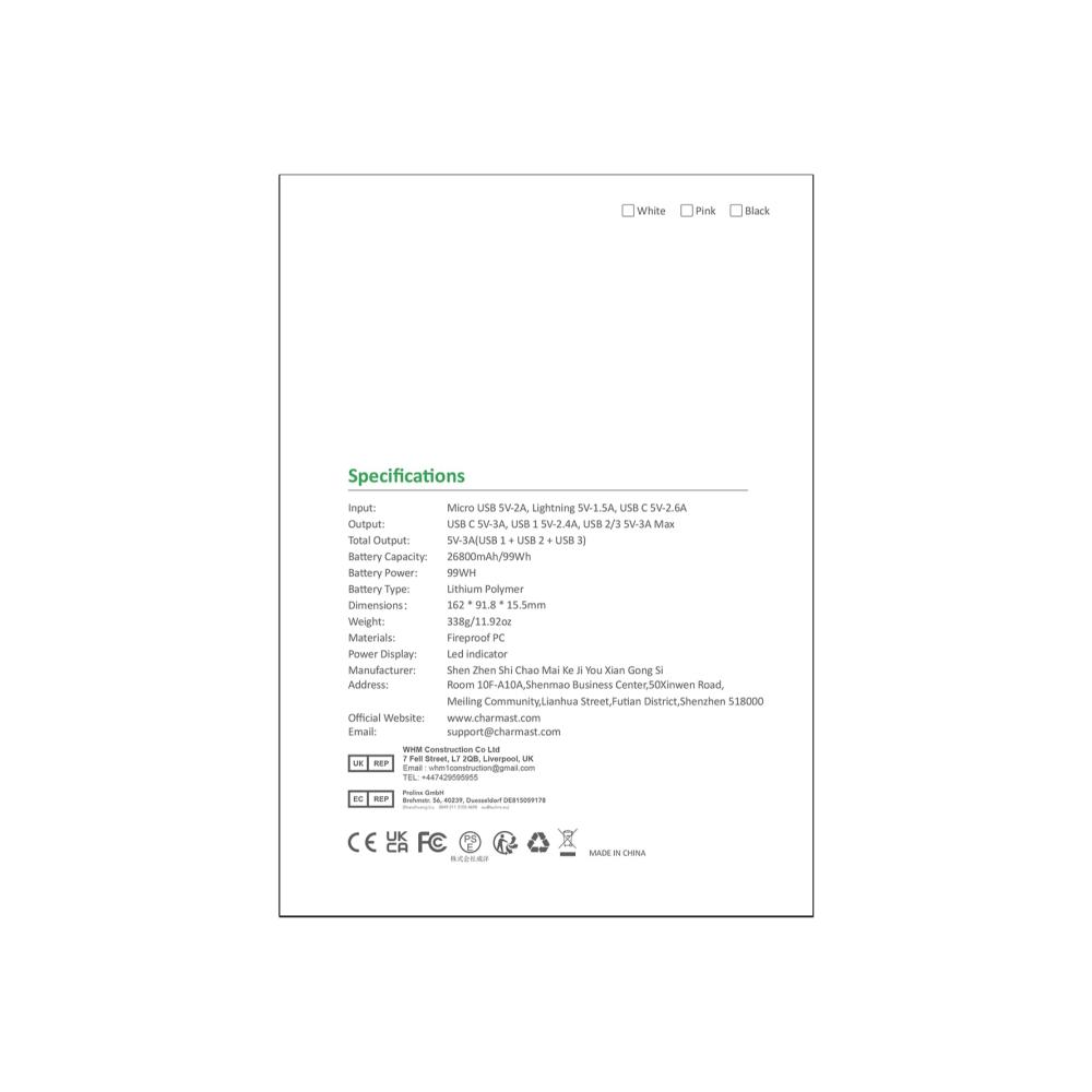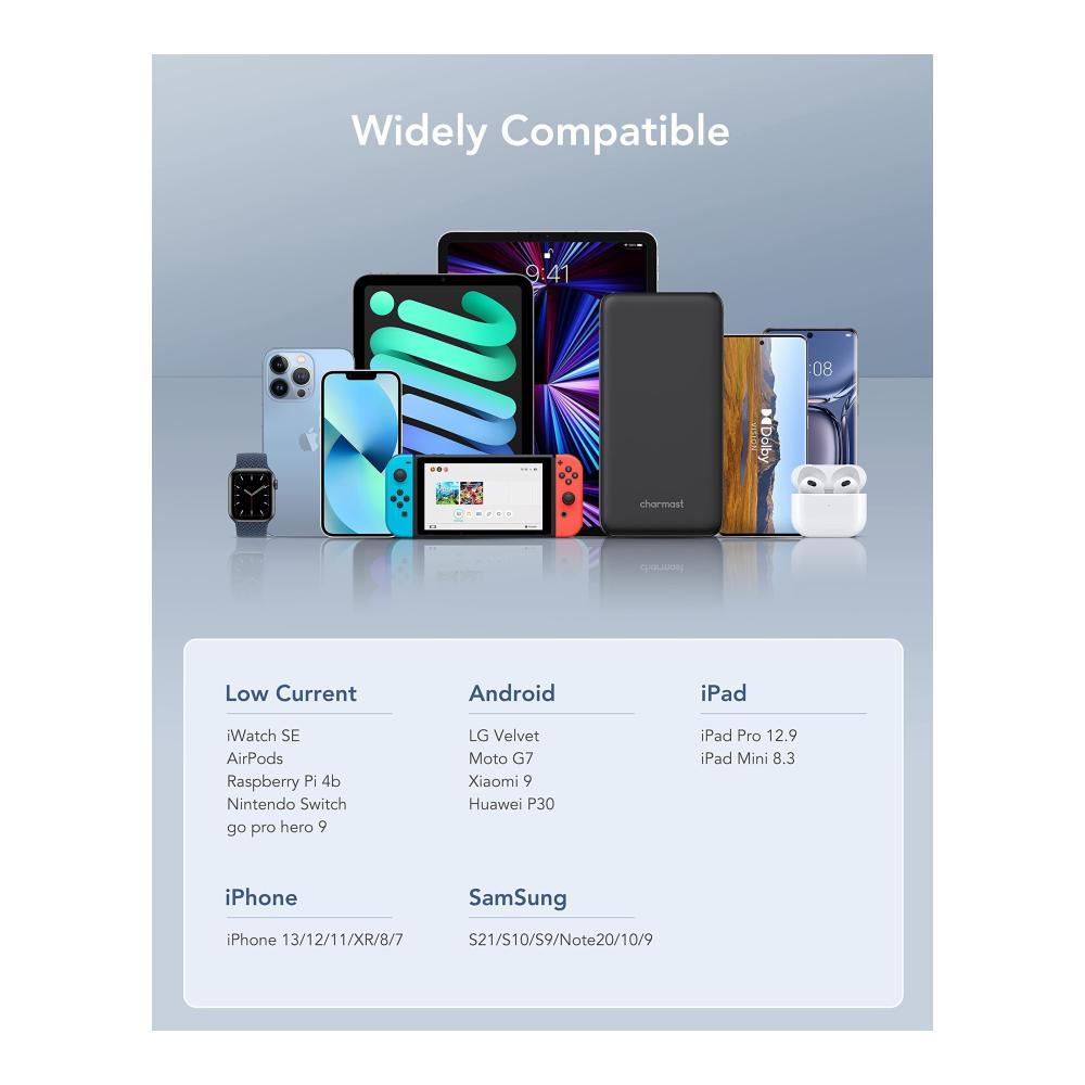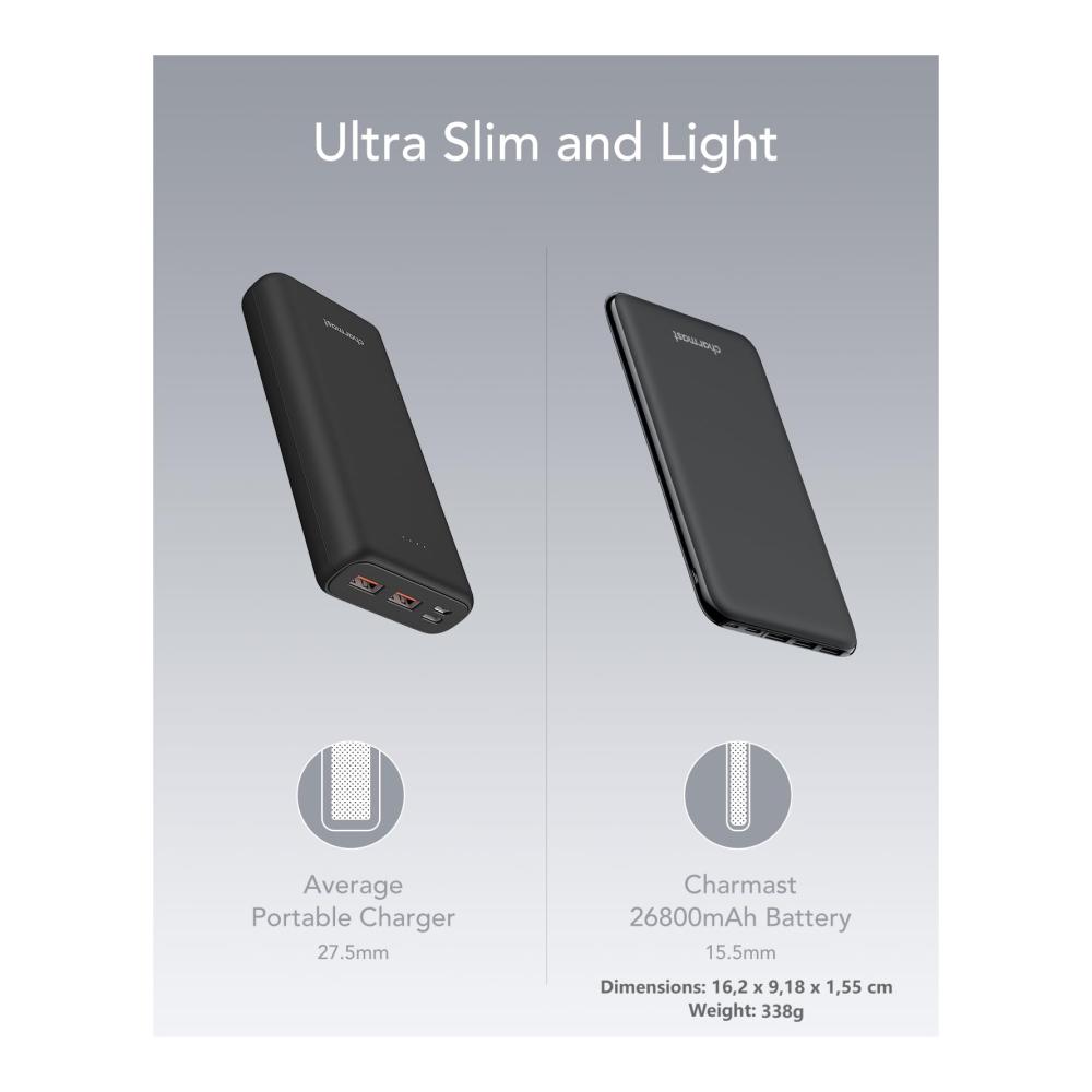 Unsere Powerbank mit 26800mAh Kapazität bietet ultraflaches Design und 4 iSmart USB Ausgangsports für schnelles Laden. Mit 3 verschiedenen USB Eingangsports und LED Batterieanzeige. Dank der Breiten Kompatibilität ist sie perfekt für unterwegs und Flugzeugreisen geeignet. Das Sicherheitsschutzsystem sorgt für sichere Nutzung. Kompatibel mit iPhone, iPad, Nintendo Switch, Samsung, Huawei und mehr. Charmast bietet seit über einem Jahrzehnt hochwertige Powerbanks für das beste Ladeerlebnis.