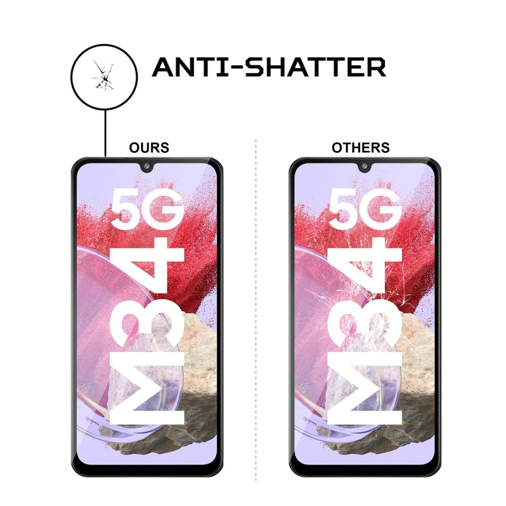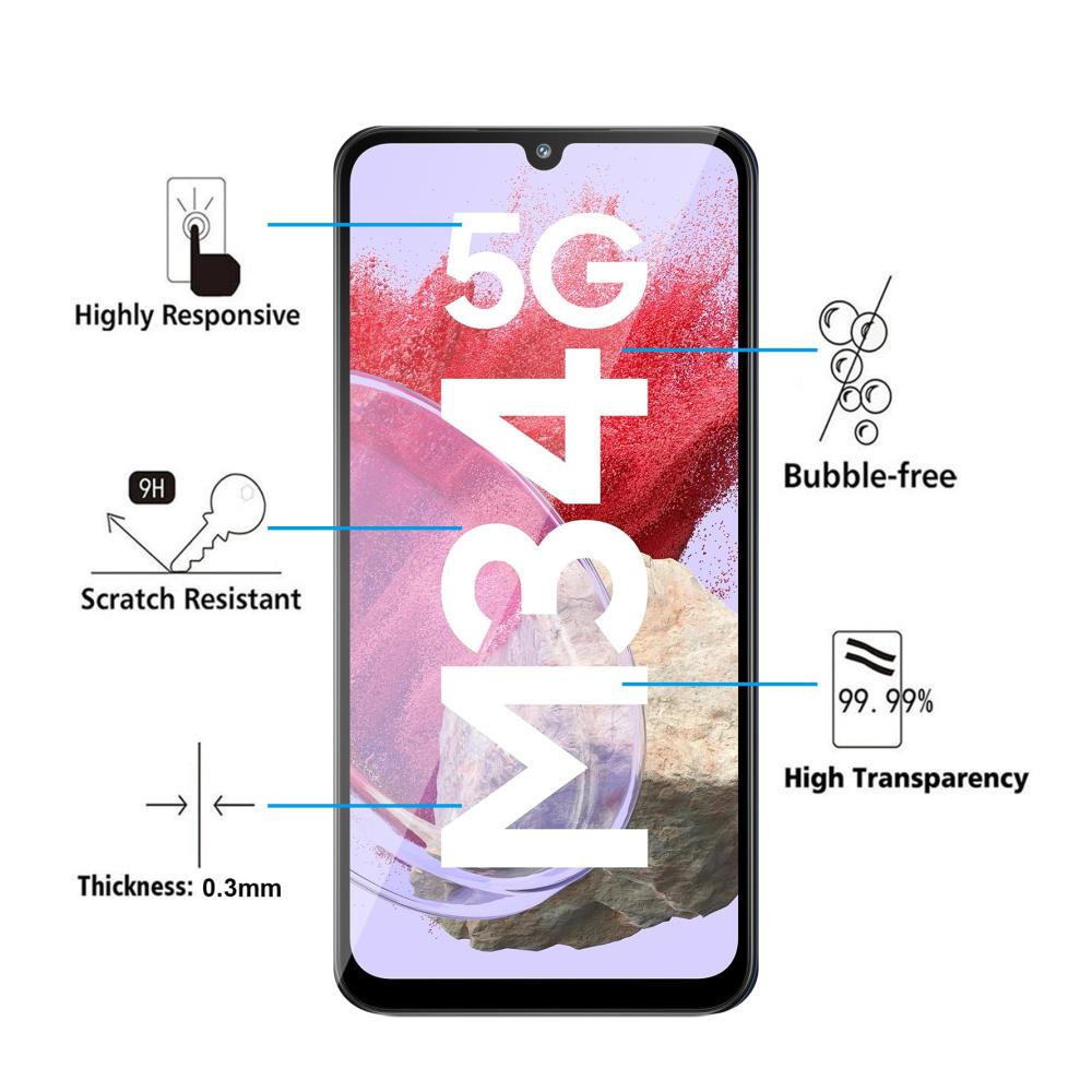 Die gehärtete Glasfolie mit 9H Härte schützt den Bildschirm effektiv vor Kratzern. Packungsinhalt: 1x Hülle für Samsung Galaxy M34 5G, 2x Displayschutz, 2x Feuchttücher, 2x Mikrofasertuch, 2x Staubdichter Aufkleber.