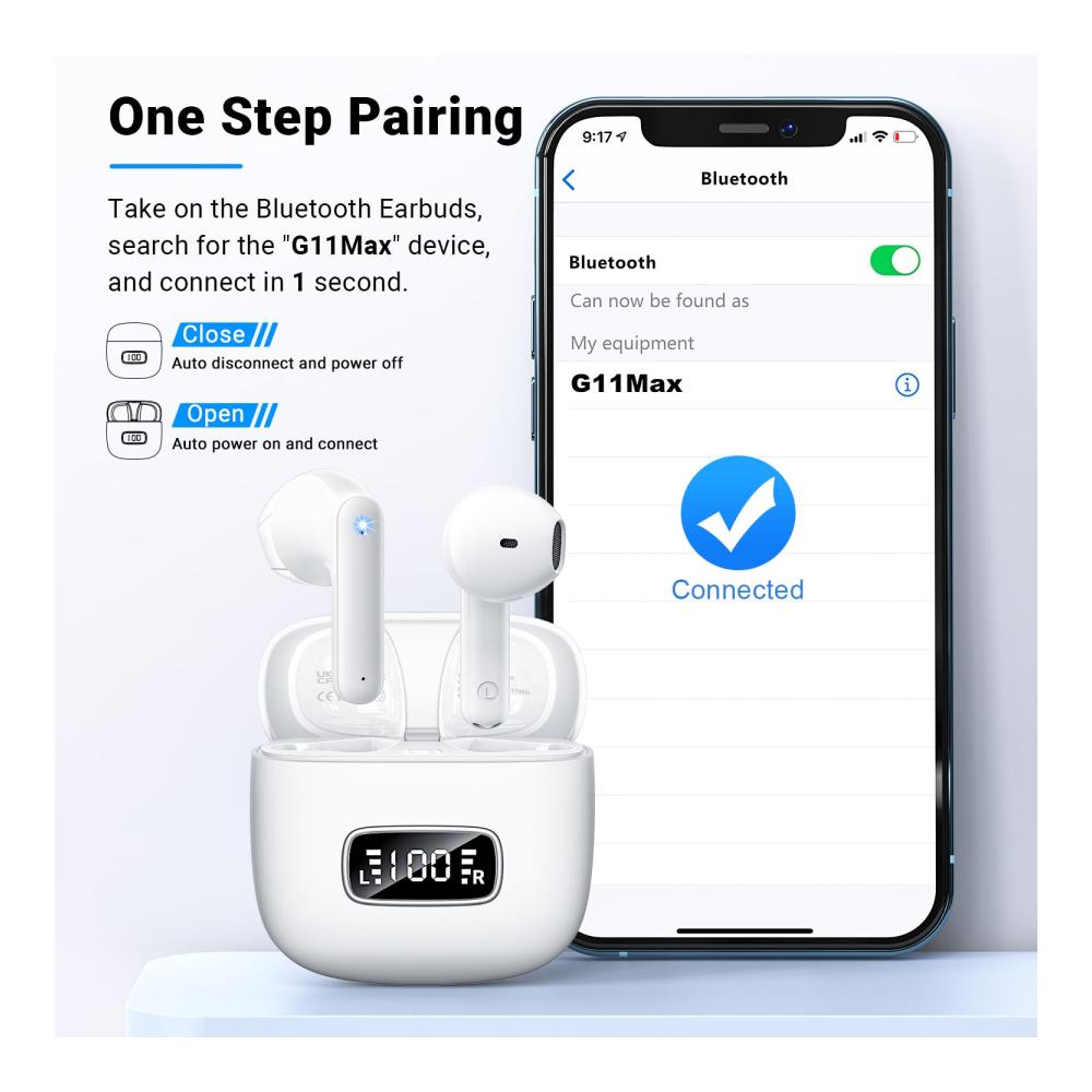 【42 Stunden Spielzeit und LED-Betriebsanzeige】: Die kabellosen Bluetooth Kopfhörer G11Max bieten Ihnen bei voller Ladung insgesamt 42 Stunden Spielzeit. Das Headset kann bis zu 6 Stunden durchhalten, und die Ladebox kann das Bluetooth-Headset noch weitere 5 Stunden lang versorgen. Die LED-Anzeige am Ladecase informiert Sie intuitiv über die verbleibende Leistung des Ladecases und der Ohrhörer.Mit der Typ-C-Schnellladeschnittstelle dauert das Aufladen nur 1,5 Stunden.