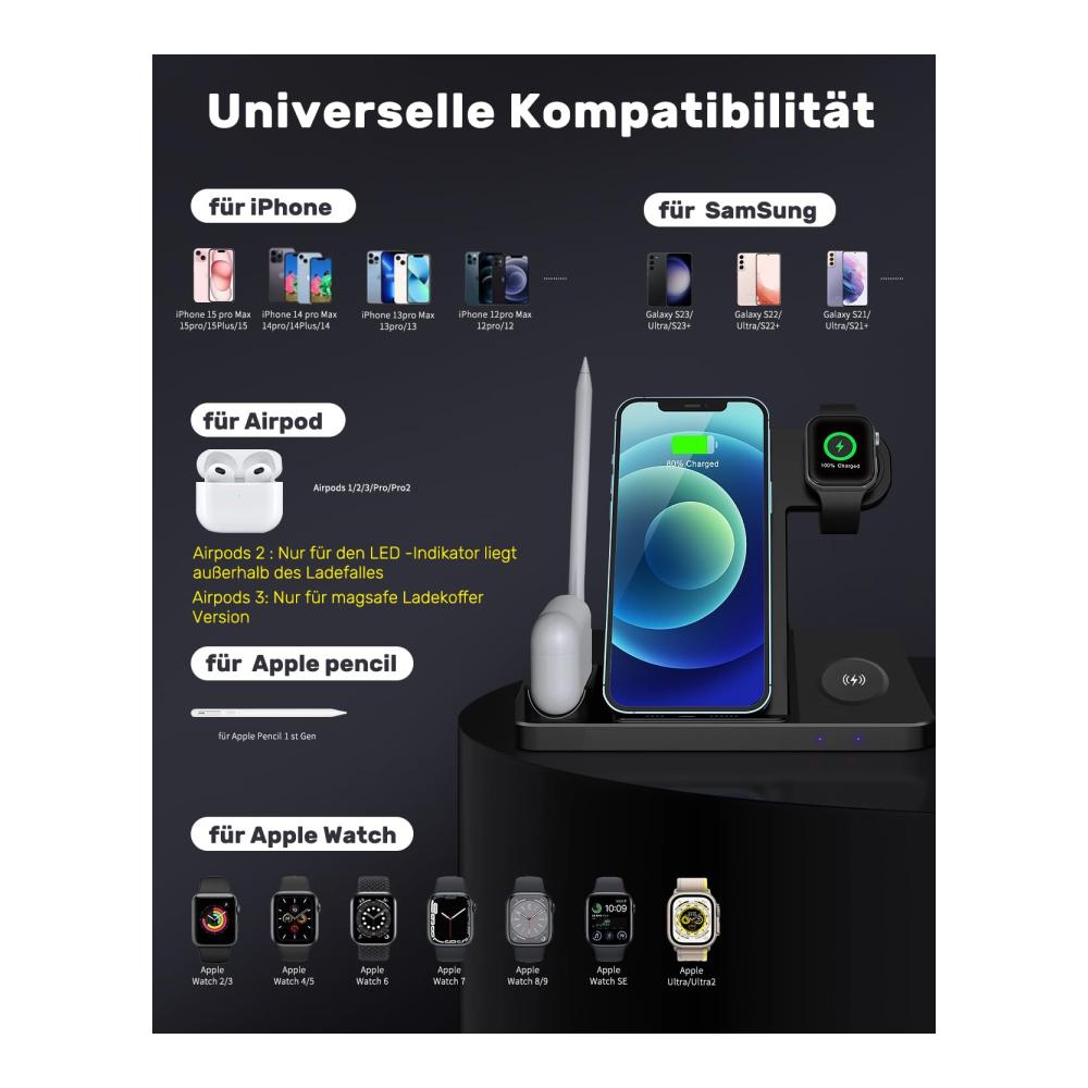 🛒【 5 in 1 Ladestation für Apple Wireless Charger 】 Die Gorbiller apple induktive ladestation wurde speziell für Ihre Apple-Geräte entwickelt und bietet eine perfekte Verbindung. Die Ladestation iPhone ist kompatibel mit dem iPhone 15 Pro Max/15 Pro/15 Plus/15/14 Pro Max/14 Pro/14 Plus/14/13 Pro Max/13 Pro/13/12 Pro Max/12 Pro/12/11 Pro Max/11 Pro/11/X/XR/XS/MAX/8/8Plus, der Samsung Galaxy S23/S22/S21/S20/Note 20/10/9/8 Serie, der iWatch Serie 9/8/7/6/5/SE/4/3/2/Ultra/2, dem Apple Pencil der 1. Generation und den Air Pods Pro/3/2/1 (Nicht kompatibel mit Samsung Watch/Huawei Watch).