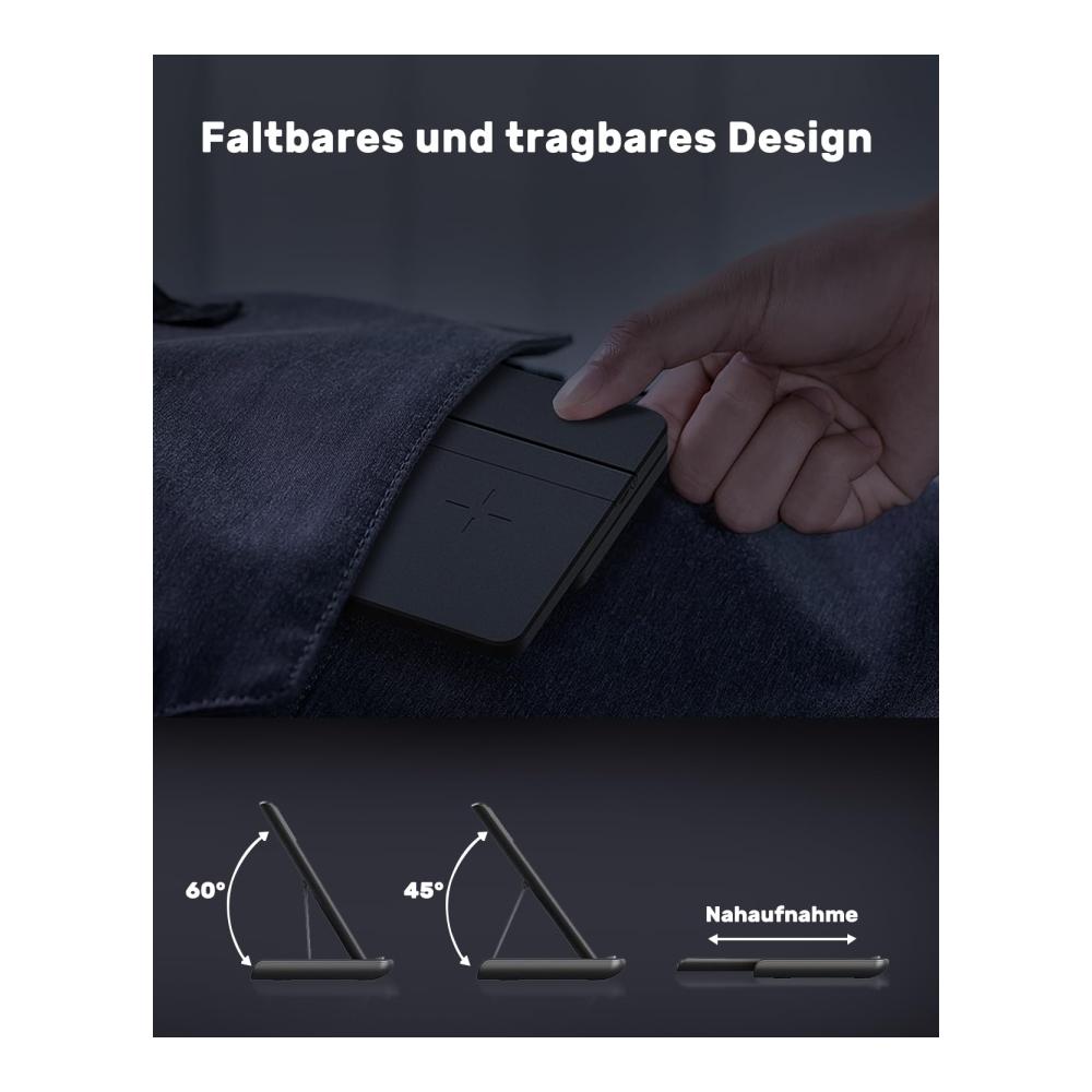 🛒【 Faltbares und Tragbares Design 】 Diese Apple iPhone Ladestation erlaubt sowohl vertikales als auch horizontales Aufladen von iPhone und Apple Watch. Sie ist leicht, faltbar und passt in Aktentaschen und Koffer, um Platz zu sparen und Kabelsalat zu vermeiden. Der Lade-Winkel ist einstellbar (0°, 45°, 60°) und sie kann auch als praktischer Handy-Ständer für Videos oder Filme während des Ladens verwendet werden.