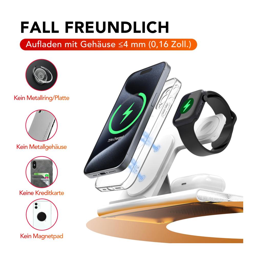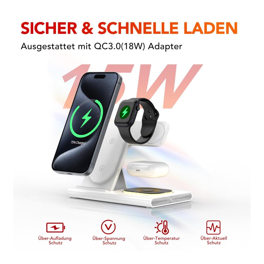 Lädt gleichzeitig drei Geräte auf einmal auf, iPhone/iWatch/AirPods zur gleichen Zeit. 2.Verfügt über eine Schnellladefunktion von 15W.