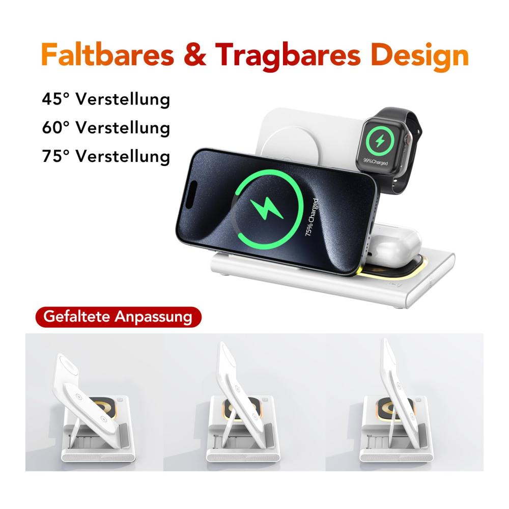 [Faltbares und tragbares Design] Diese Reise-i Phone- und Apple Watch-Ladestation verfügt über ein leichtes, faltbares Design, das das Tragen in Ihrer Tasche oder Ihrem Koffer erleichtert und ein stabiles Ladeerlebnis auf Reisen oder Geschäftsreisen bietet. Diese Ladestation für Apple-Geräte verfügt über ein Neigungswinkel-Design mit 4 einstellbaren Winkeln und unterstützt sowohl vertikale als auch horizontale drahtlose Ladegeräte sowie eine bessere Anzeige von Videos und Telefonen.