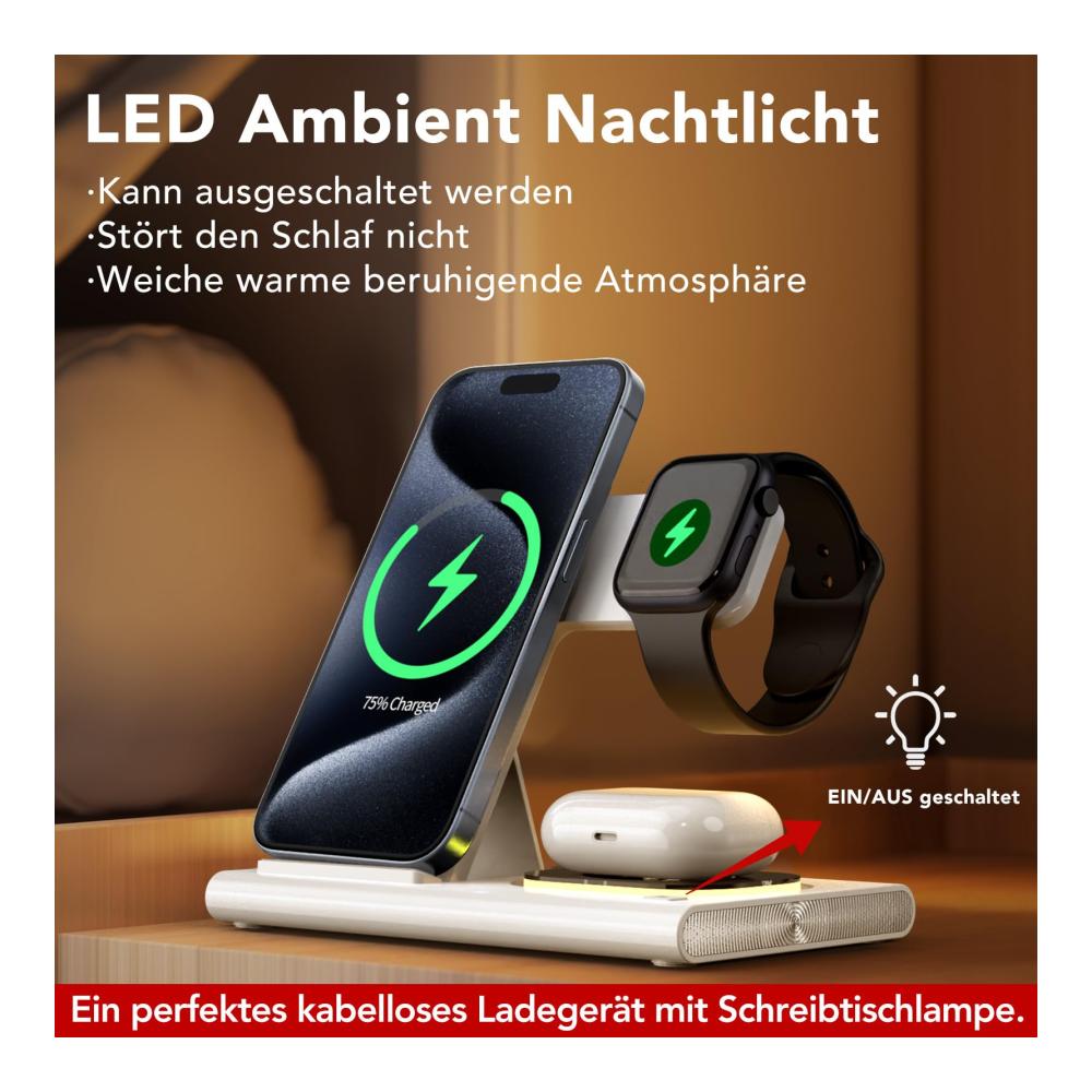 [LED-Umgebungslicht ein/ausschalten] Die i Phone-Nachttisch-Ladestation sieht elegant aus und der gesamte Ladebereich wird drahtlos aufgeladen.Das LED-Nachtlicht spendet ein weiches, warmes Licht, das den Schlaf nicht stört und für eine beruhigende Atmosphäre im Raum sorgt.und es kann über den Knopf neben dem Ladebereich der Pods ausgeschaltet werden. Ein perfektes kabelloses Ladegerät mit Schreibtischlampe.