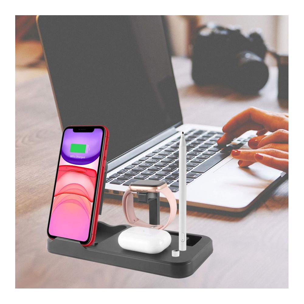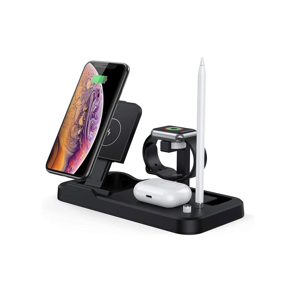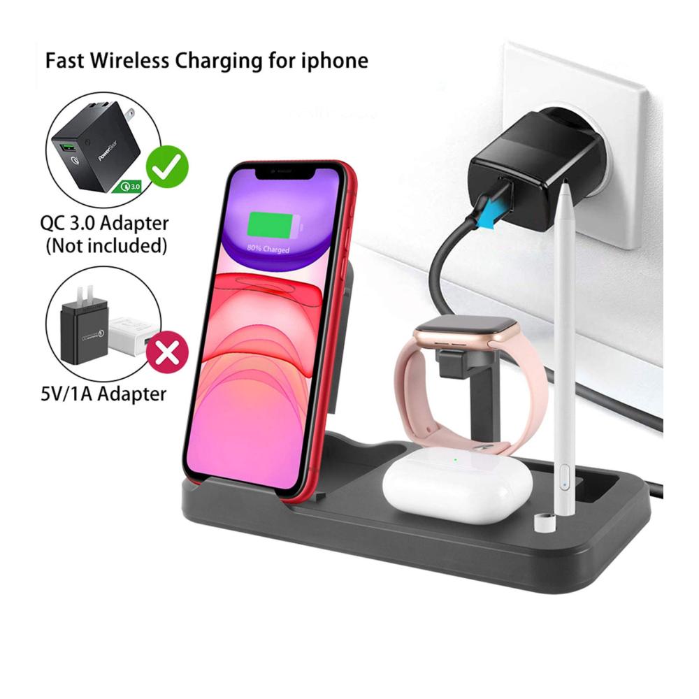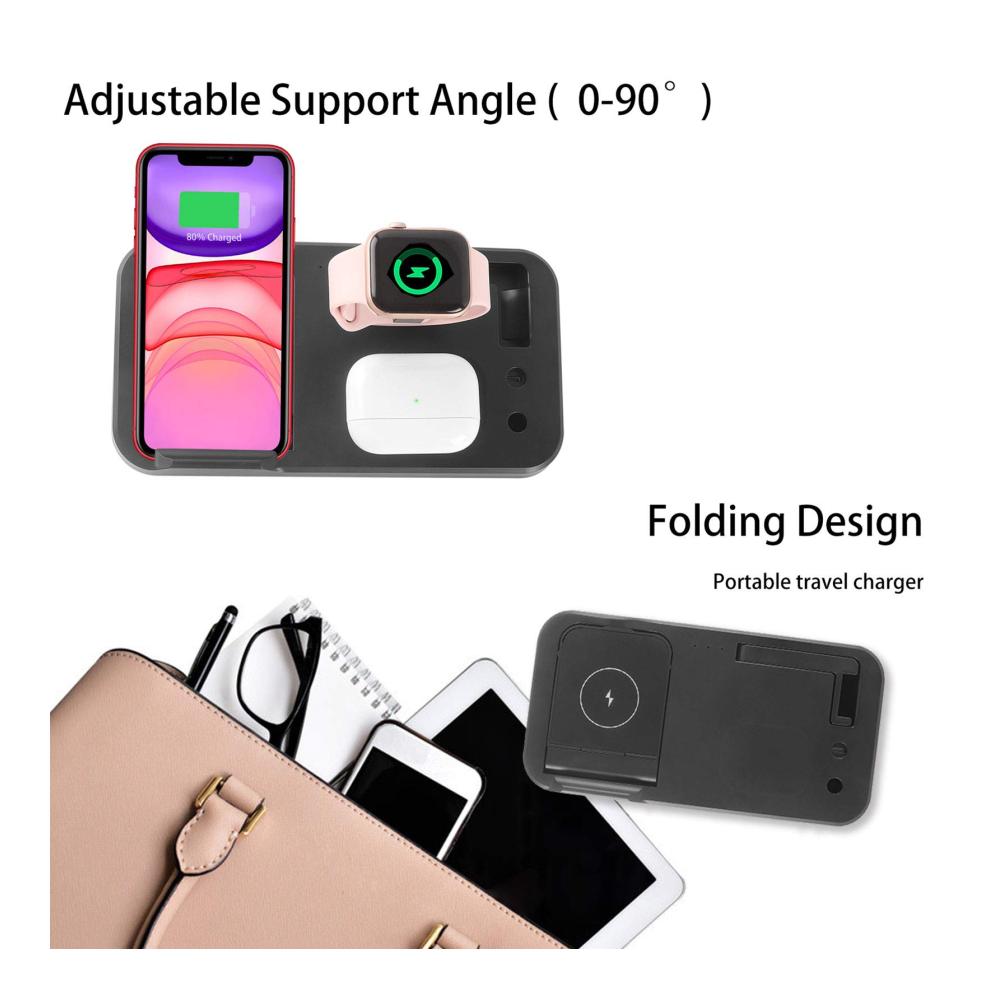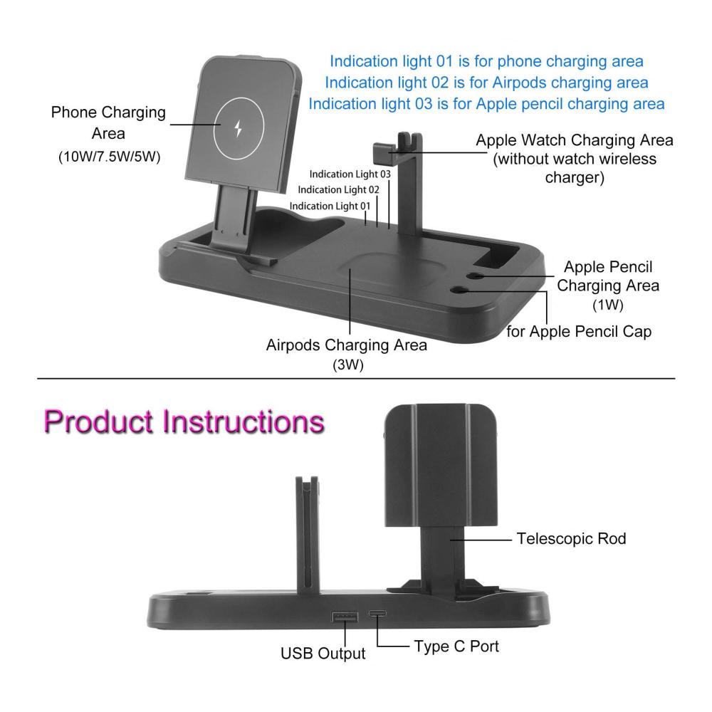 4-in-1 kabellose Ladestation für AirPods Pro/2/Galaxy Buds/Qi-fähige Telefone/Apple Pencil der 1. GenerationEigenschaften: 1. Es ist aus hochwertigem ABS-Gehäuse, leistungsstark, robust und langlebig mit einem rutschfesten Silikon-Pad an der Unterseite. 2. Überlegene Sicherheit: Zertifiziert für einwandfreies Arbeiten mit jedem Qi-kompatiblen Telefon, bietet eine sichere Ladung für Sie und Ihre Geräte. 3. Laden Sie Ihr Telefon vertikal oder horizontal auf: Befreien Sie Ihre Hände, um Filme, SMS-Nachrichten, Anrufe und Chatten während des Ladevorgangs zu sehen. 4. Praktisch, schön und leistungsstark: Faltbares Design, geeignet für Zuhause und im Büro und einfach mitzunehmen, wenn Sie unterwegs oder auf Reisen sind. Hinweise: 1. Nicht kompatibel mit iPhone 12 Mini! 2. Für die Schutzhülle sollte man sie zum Aufladen entfernen. 3. Das Uhrenteil hat keine kabellose Ladefunktion und benötigt ein original kabelloses Ladegerät zum Aufladen. 4. Bitte legen Sie keine metallischen oder magnetischen Objekte zwischen Ihrem Telefon und Ladegerät. 5. Wenn Ihr iPhone-System auf 14.3 aufgerüstet ist, können einige direkt aufgeladen werden, und einige direkte Aufladung führt zu schlechtem Kontakt / überhaupt keine Ladung.Wenn dies Ihnen passiert, machen Sie sich keine Sorgen, schalten Sie das Telefon aus und starten Sie es neu. Sie können normal aufladen. Kompatible Modelle: * 10W: für Samsung Galaxy S22/S21/S20/S10/S10 Plus/S9/S9 Plus/Note 9/8/S8/S8 Plus/S7/S7 Edge. * 7,5 W: für iPhone 12/12 Pro/11/11 Pro/11 Pro Max/XS Max/XR/XS/X/8/8P. * 5 W Standardladung (mit 5 V/2 A Adapter): für andere Qi-kompatible Geräte. * 3W: AirPods 2/Pro; Galaxy Buds/Buds /Buds Live * 2W: Apple Pencil der 1. Generation