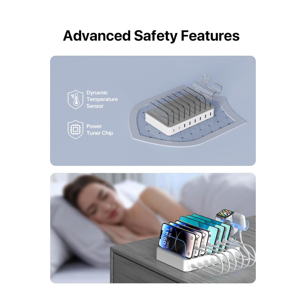 Die Ladestation für mehrere Geräte von SooPii ist ein vielseitiges Ladegerät mit einem 70-W-8-Port-Design, einschließlich eines PD-20-W-Ports für Mobiltelefone, Tablets und mehr. Kompatibel mit einer Vielzahl von Geräten wie lPhone 15/Pro Max/15 Pro/15 Plus, Samsung Galaxy Note 20/S21/S20/S22/S23, Google Pixel 2/2XL/3/3XL/3a/4/4/5/6 XL und mehr. Diese Ladestation bietet Platz für 9 Trennwände und einen verbesserten Halter für Watch-Ladegeräte und AirPods, um Ihre schwereren Geräte zu organisieren. Die dynamische Temperaturüberwachung und der Power-Tuner-Chip schützen vor Überladung und Überhitzung. Mit der intelligenten blauen LED-Anzeige wissen Sie genau, wann Ihre Geräte vollständig aufgeladen sind. Enthält 8 gemischte Ladekabel, darunter USB-A auf lPhone/lPad, USB-A auf USB-C, USB-A auf Micro und USB-C auf USB-C, um Ihre Ladeanforderungen zu erfüllen.