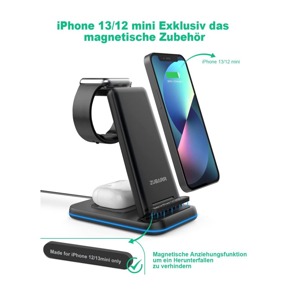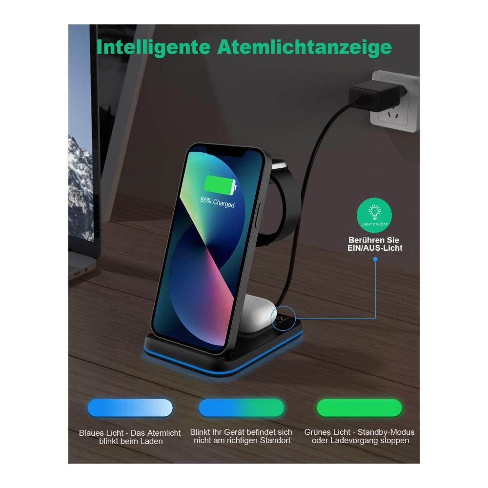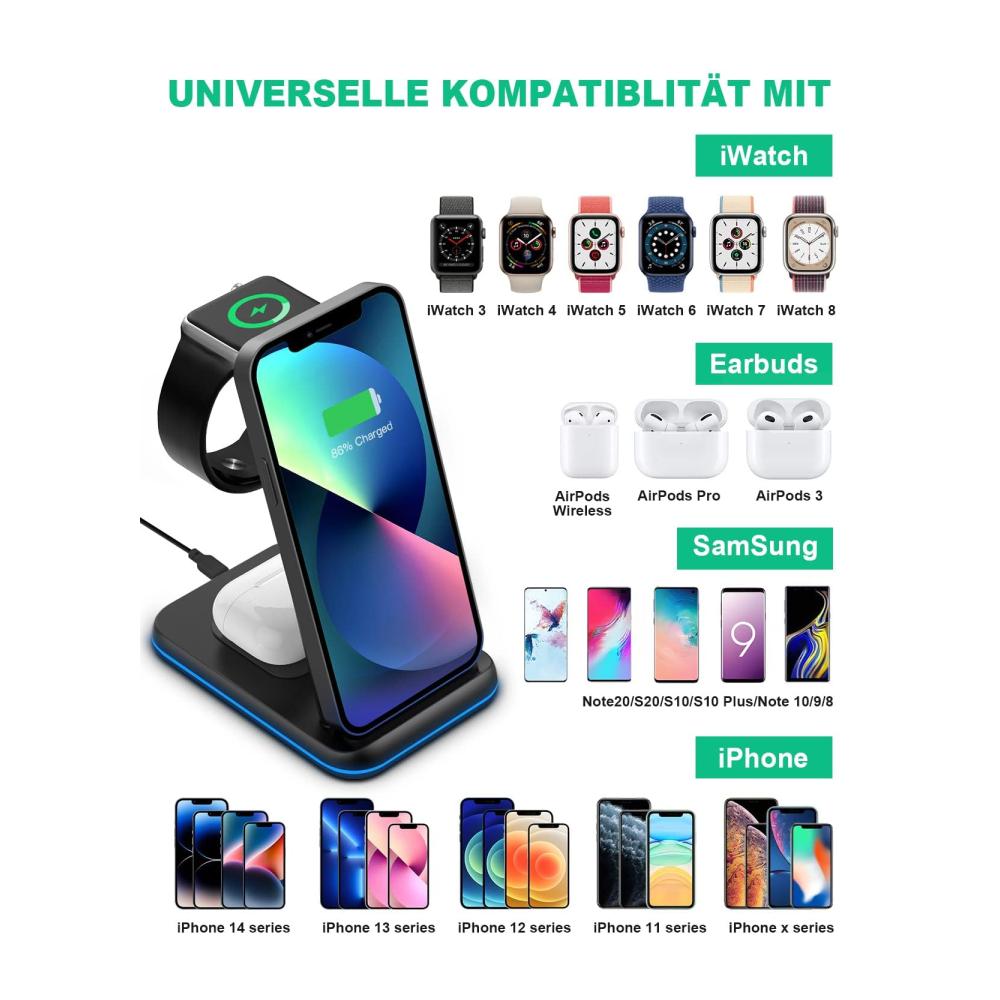 【Weitgehend kompatibel】Die Ladestation ist kompatibel mit iPhone 15 series/14 series/13 series/12 series/11 series/SE/XR/XS/ XS Max/ 8/8 Plus, Samsung Galaxy S21/S21 Plus/S21 Ultra/S20/S20 fe/S20 /S10/S10 /S9/S9 /S8 und andere Geräte, die kabelloses Laden unterstützen. Auch kompatibel mit Apple Watch 9/Ultra 2/8/7/6/5/4/3/SE, AirPods 2 (mit kabellosem Ladecase)/3/Pro. (Hinweis: Nicht kompatibel mit iWatch 1, Samsung Watch, AirPods 1)