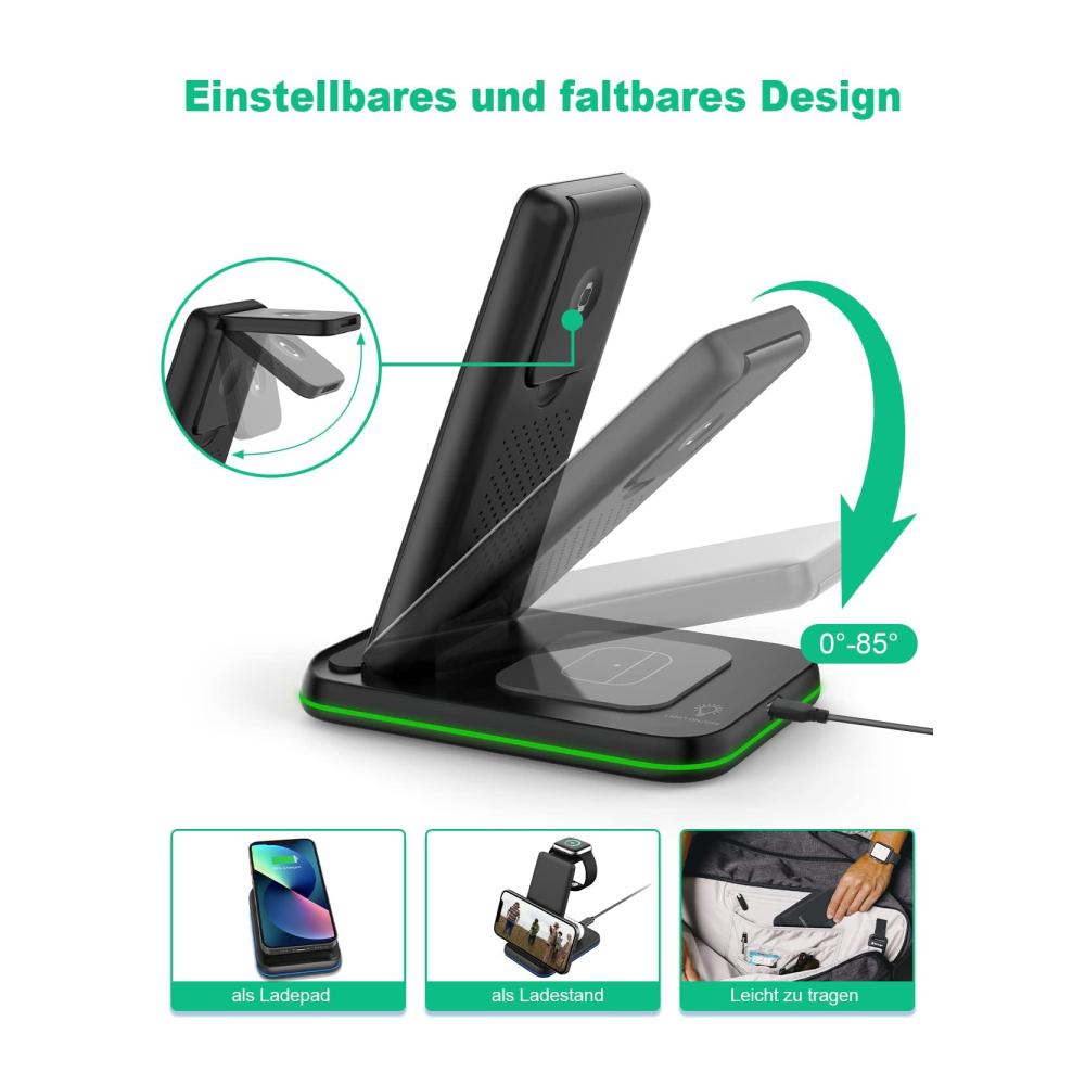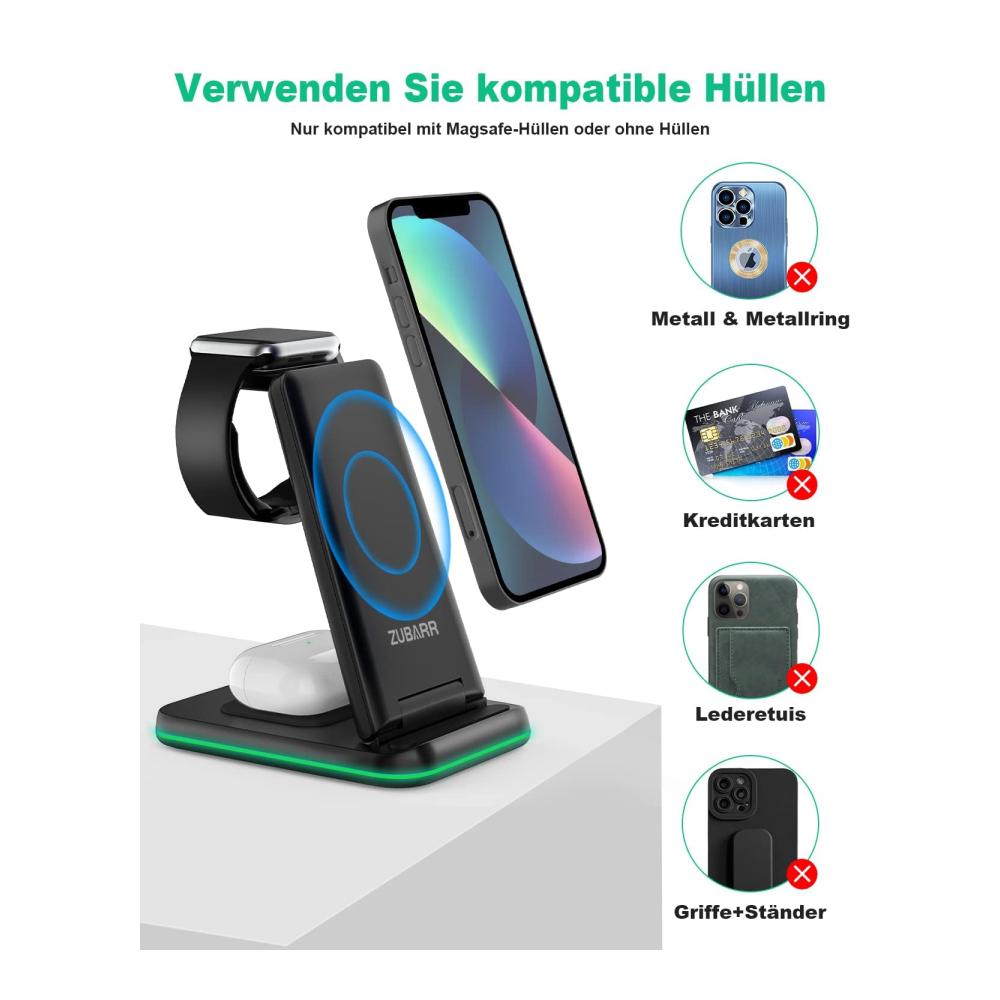 【3 in 1 kabelloses ladegerät】Das kabelloses ladegerät unterstützt das Aufladen von Telefonen, Uhren und Kopfhörer gleichzeitig.(Empfohlen für hone fall <4mm)