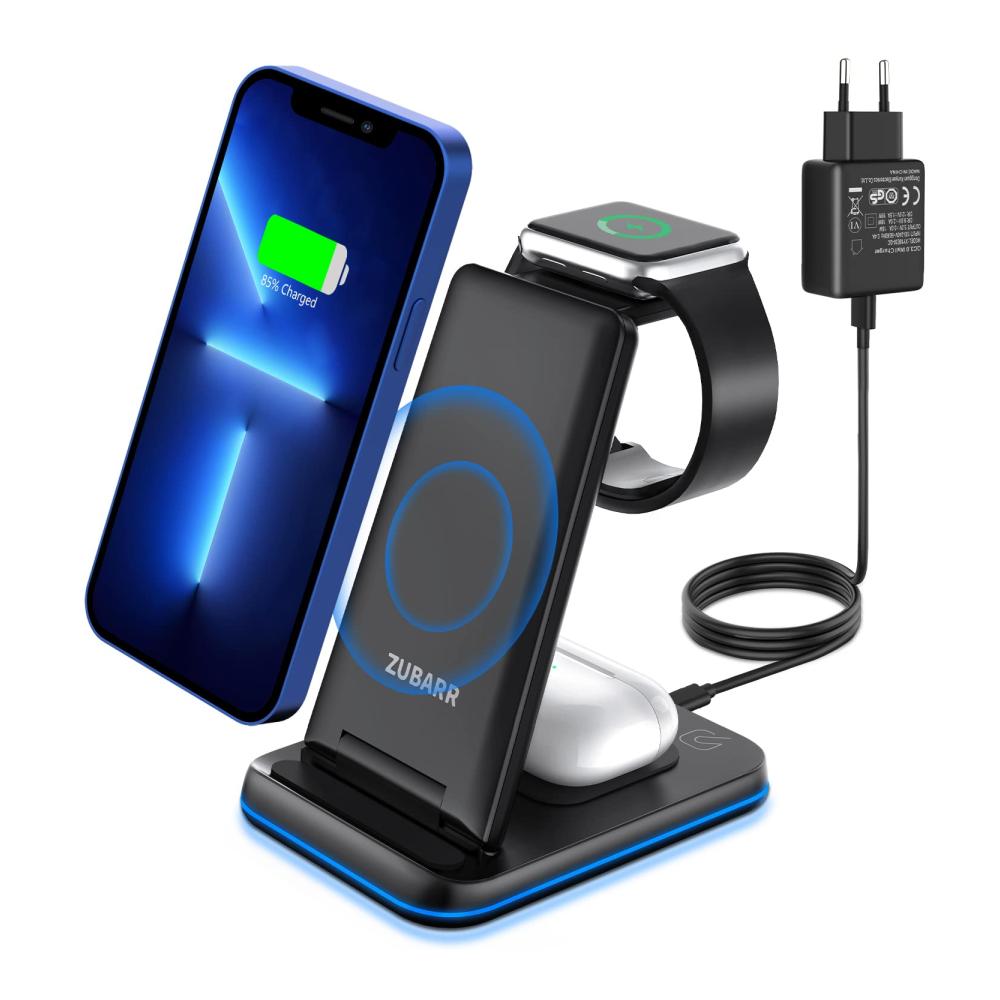 Das ZUBARR Faltbare Kabellose Ladegerät ist eine multifunktionale Ladestation für Ihre Mobilgeräte. Mit USB Typ C Steckverbindung und 15 Watt Leistung unterstützt es das kabellose Laden von iPhone 15/14/13/12/11 Pro Max/XR/XS/8, Samsung Galaxy, Apple Watch 9/Ultra 2/SE/8/7/6/5/4/3 und AirPods. Die Ladestation kommt in elegantem Schwarz und bietet intelligenten Schutz vor Überstrom, Überspannung und Überhitzung. Dank des faltbaren Designs ist sie perfekt für unterwegs geeignet.