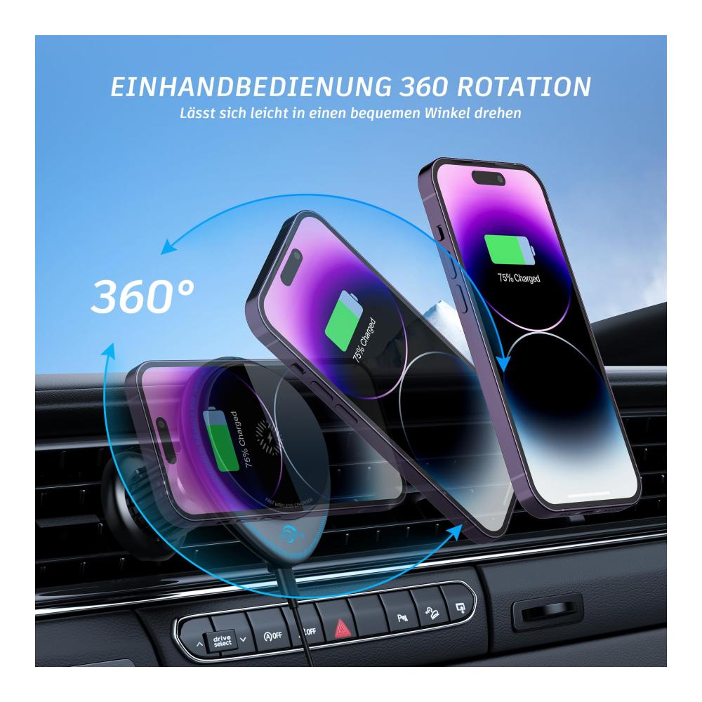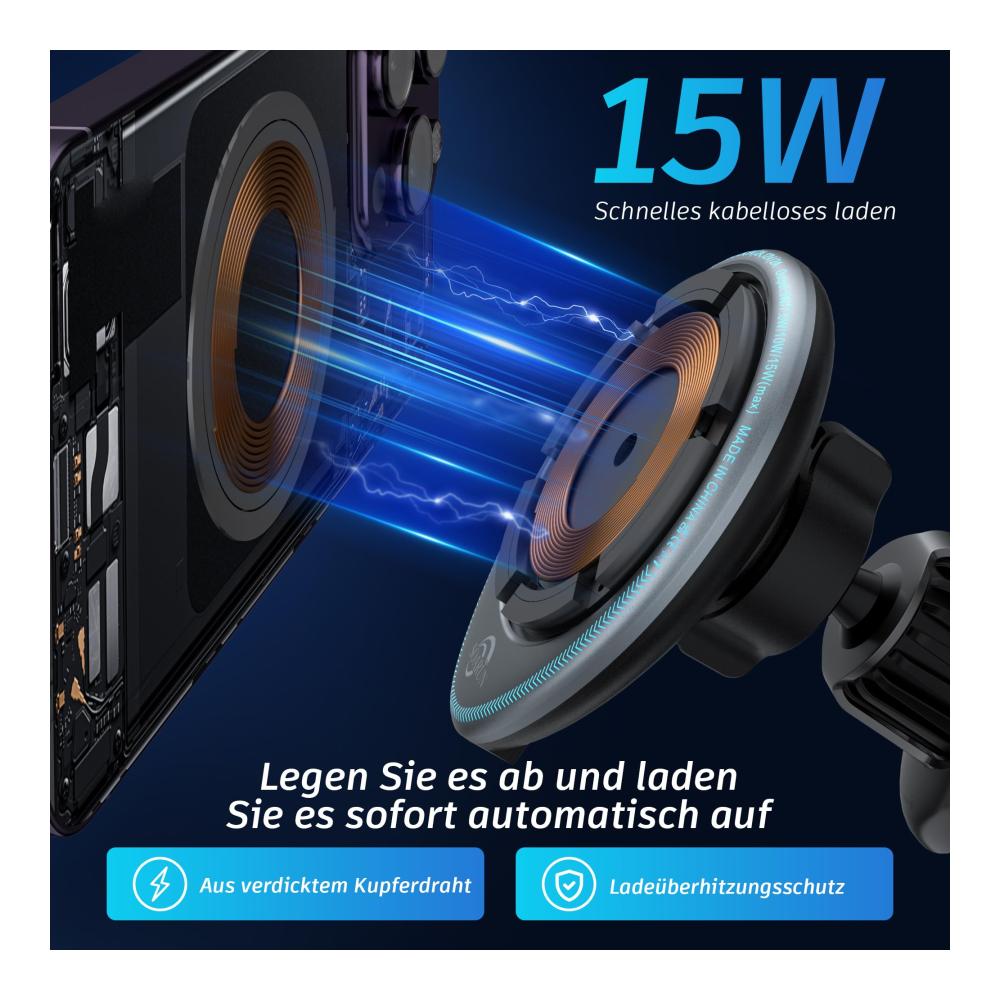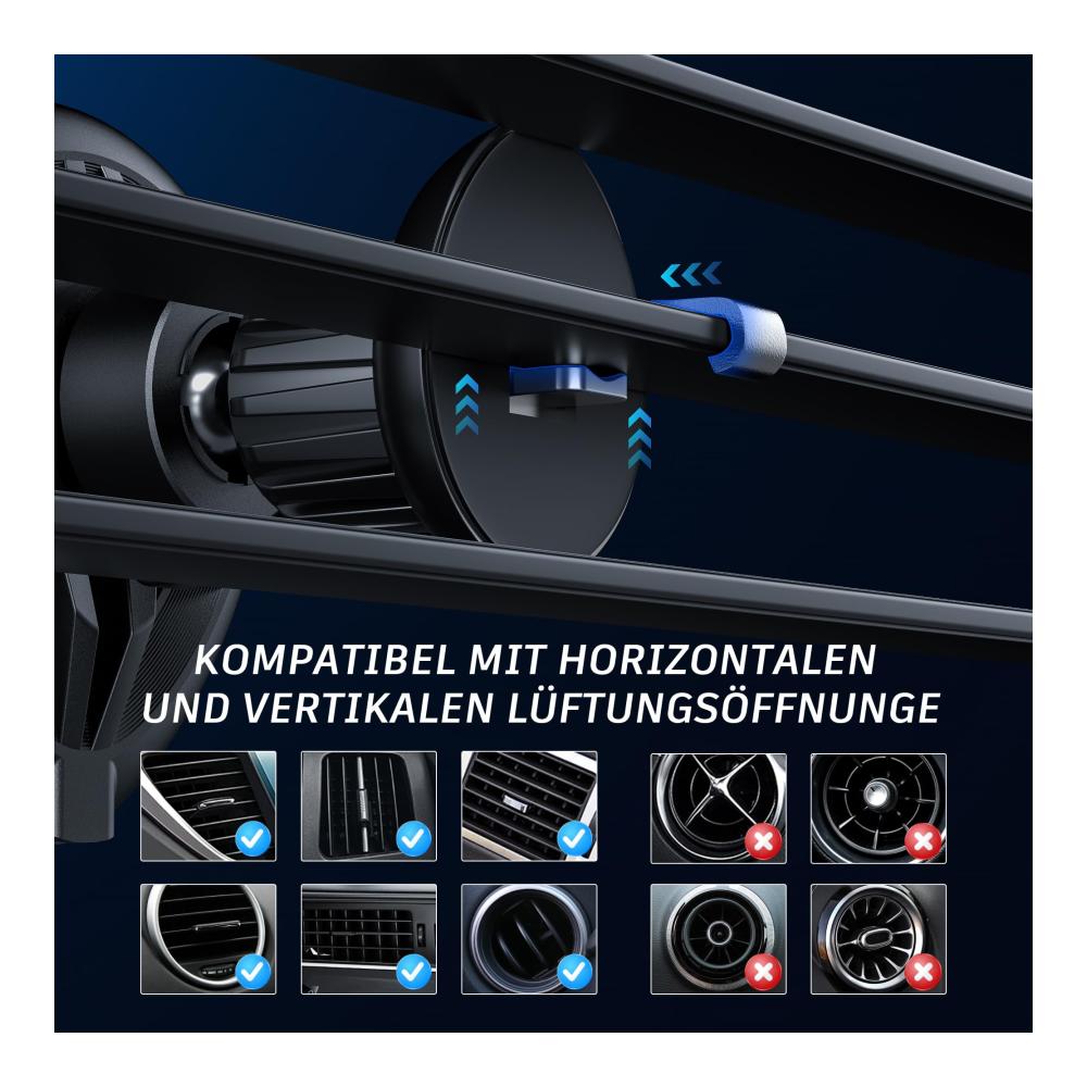 Dank der 15W-Schnellladefunktion und der flexiblen Montagemöglichkeiten an vertikalen und horizontalen Lüftungsschlitzen ist unser Produkt ideal für unterwegs. Im Lieferumfang enthalten sind ein Magnetring sowie ein Magsafe-Ladegerät für maximale Vielseitigkeit und Komfort.