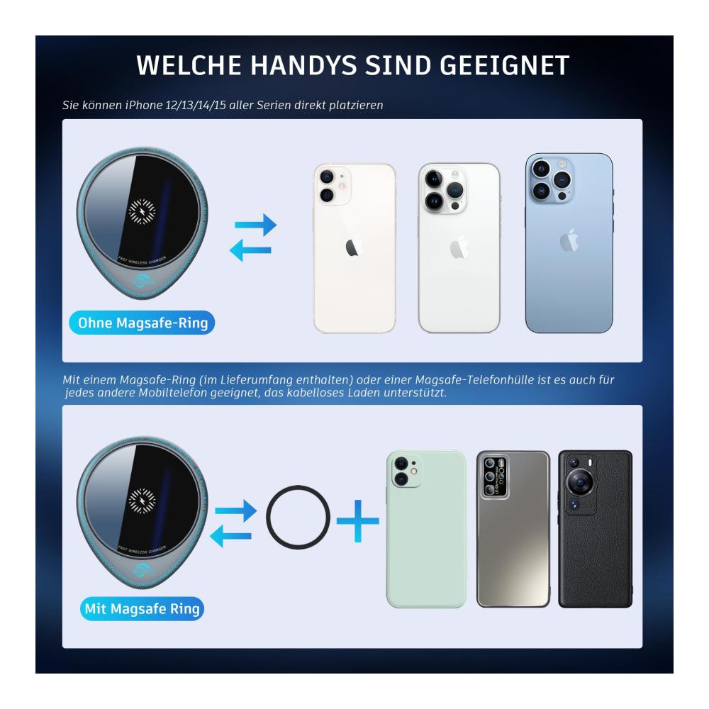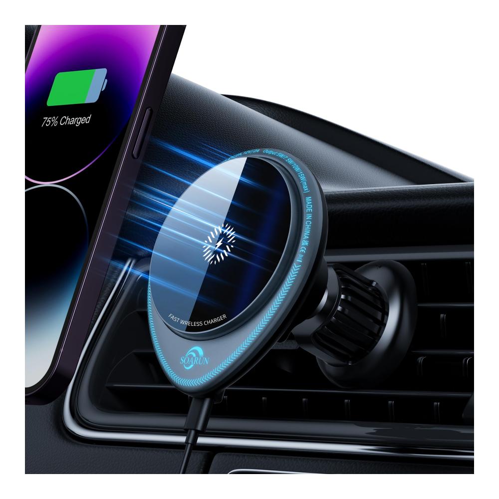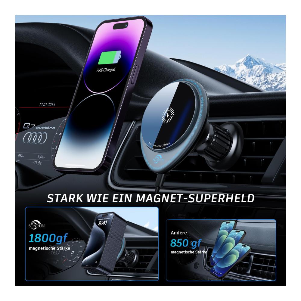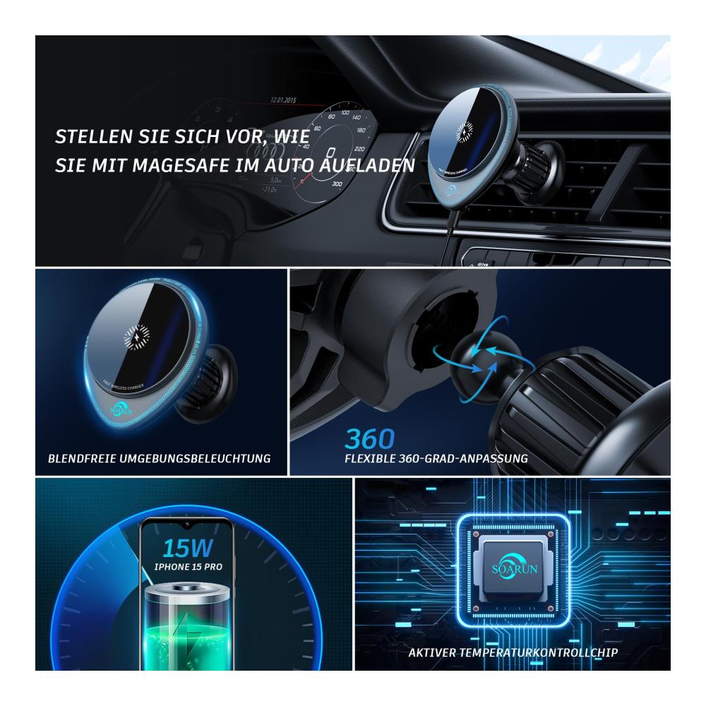 Dank der 15W-Schnellladefunktion und der flexiblen Montagemöglichkeiten an vertikalen und horizontalen Lüftungsschlitzen ist unser Produkt ideal für unterwegs. Im Lieferumfang enthalten sind ein Magnetring sowie ein Magsafe-Ladegerät für maximale Vielseitigkeit und Komfort.