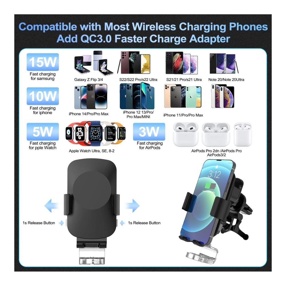Neu aufgerüstetes drahtloses Doppelspulen-Autoladegerät: Fast wireless charger auto rüsten sie die hochpräzise Doppelspulen-Spule aus reinem Kupfer auf, um eine größere drahtlose Ladereichweite für Mobiltelefone, importierte Dual-Chip- und Typ-C-Schnittstellen zu schaffen. Unterstützt iPhone maximale Leistung 7,5 W, Apple Watch maximale Leistung 5 W, AirPods maximale Leistung 3 W Schnellladung und Unterstützung Samsung Flip4/3/2 (maximale Leistung 10 W)