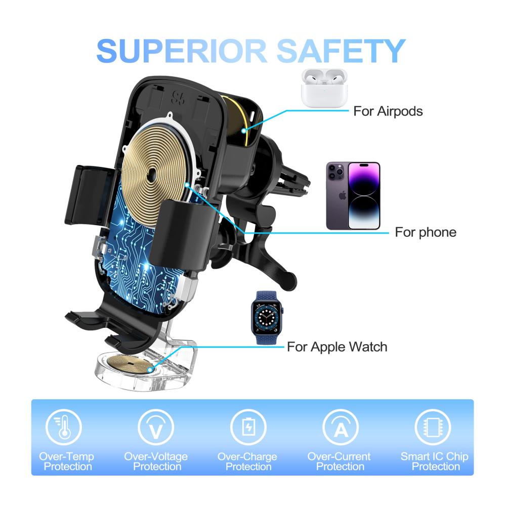 Sicherheitsschutzfunktion: Das intelligente auto handyhalterung mit ladefunktion verfügt über Funktionen wie Überstromschutz, Überhitzungsschutz, Kurzschlussschutz und Überspannungsschutz, um die Ladesicherheit zu gewährleisten. Darüber hinaus ist dieses kabellose Ladegerät QI-zertifiziert und entspricht internationalen Standards und bietet maximalen Schutz für Ihre Sicherheit.