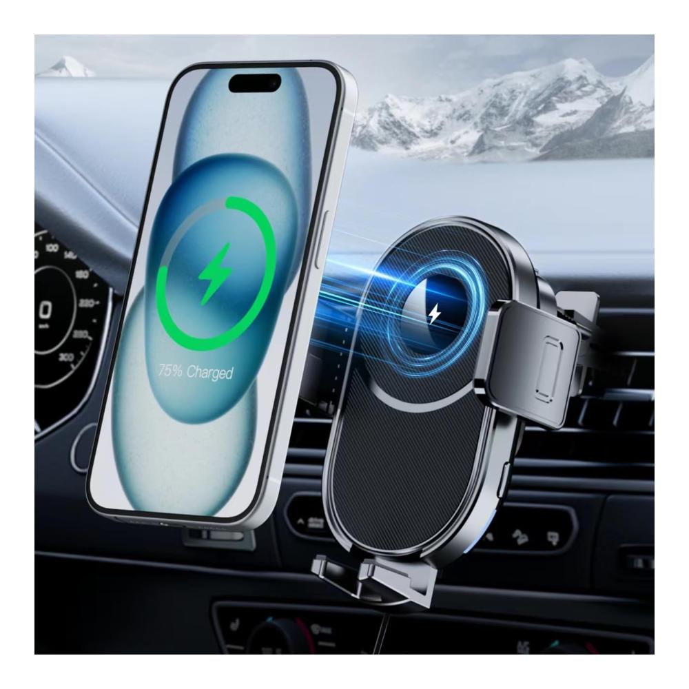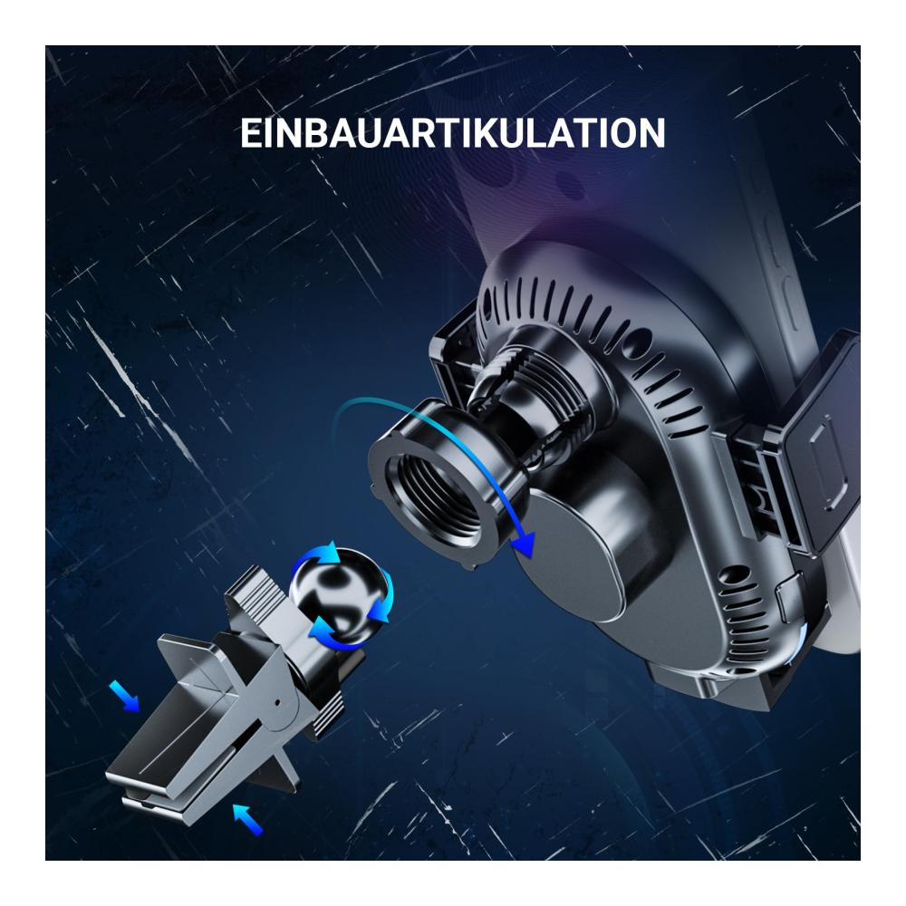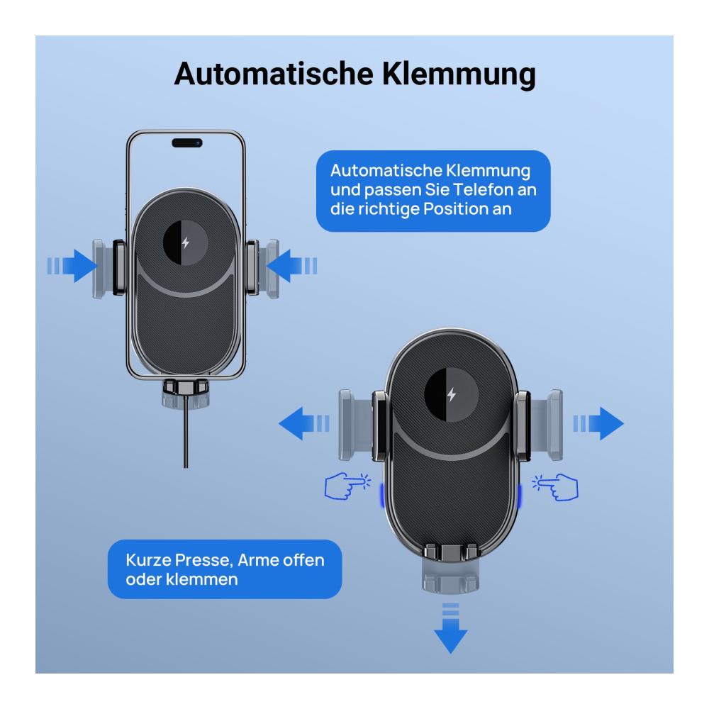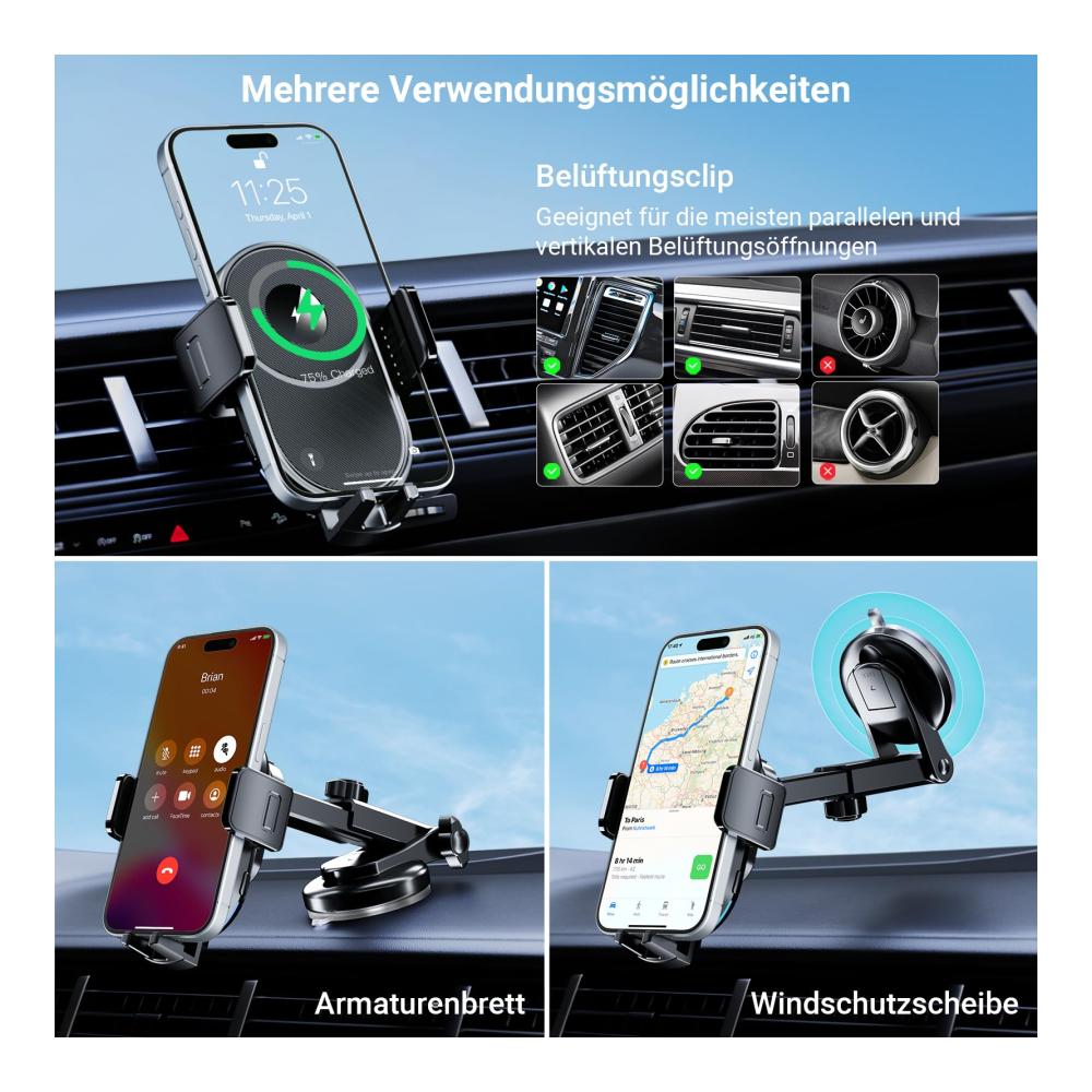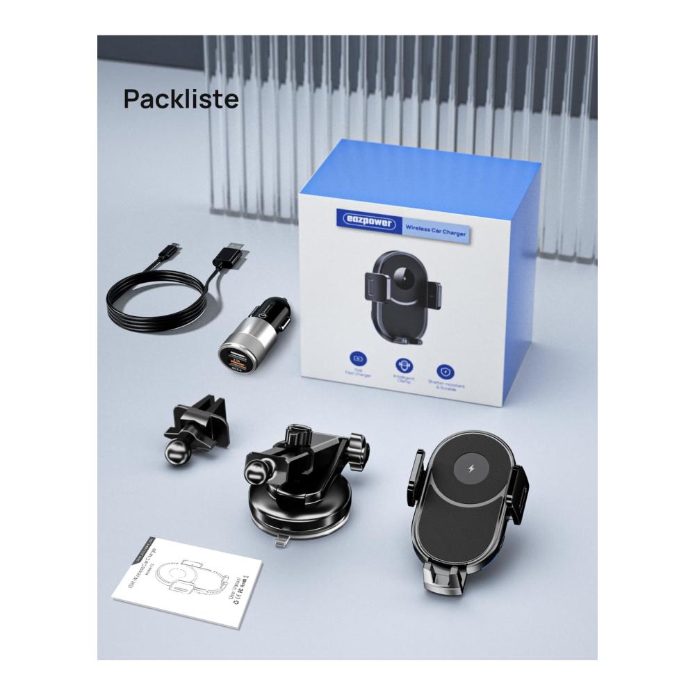 Unsere Eazpower Auto Handyhalterung mit Ladefunktion ist ein praktisches Zubehör für Ihr Fahrzeug. Mit einer Leistung von 15 Watt und einer Eingangsspannung von 9 Volt können Sie Ihr Qi-fähiges Gerät unterwegs bequem aufladen. Diese Handyhalterung ist tragbar und einfach zu verwenden. Die automatische Klemmung sorgt für einen sicheren Halt, während die Lüftungshalterung eine optimale Positionierung ermöglicht. Die Bilder zeigen das elegante Design und die Vielseitigkeit dieser Halterung. Holen Sie sich jetzt die ultimative Lösung für kabelloses Laden im Auto!